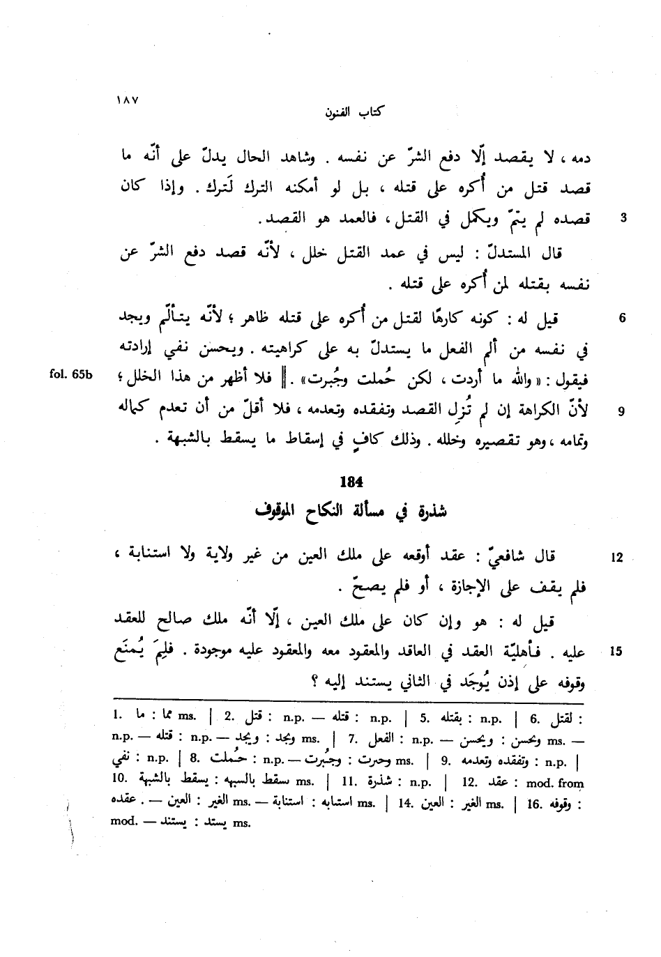 قيل له: كونه كارهًا لقتل من أكره على قتله ظاهر؛ لأنه يتألم ويجد في نفسه من ألم الفعل ما يستدل به على كراهيته. ويحسن نفي إرادته فيقول: ((والله ما أردت، لكن حملت وجبرت)). || فلا أظهر من هذا الخلل؛ لأن الكراهة إن لم تزل القصد وتفقد هو تعدمه، فلا أقل من أن تعدم كماله وتمامه، وهو تقصيره وخلله. وذلك كافٍ في إسقاط ما يسقط بالشبهة.