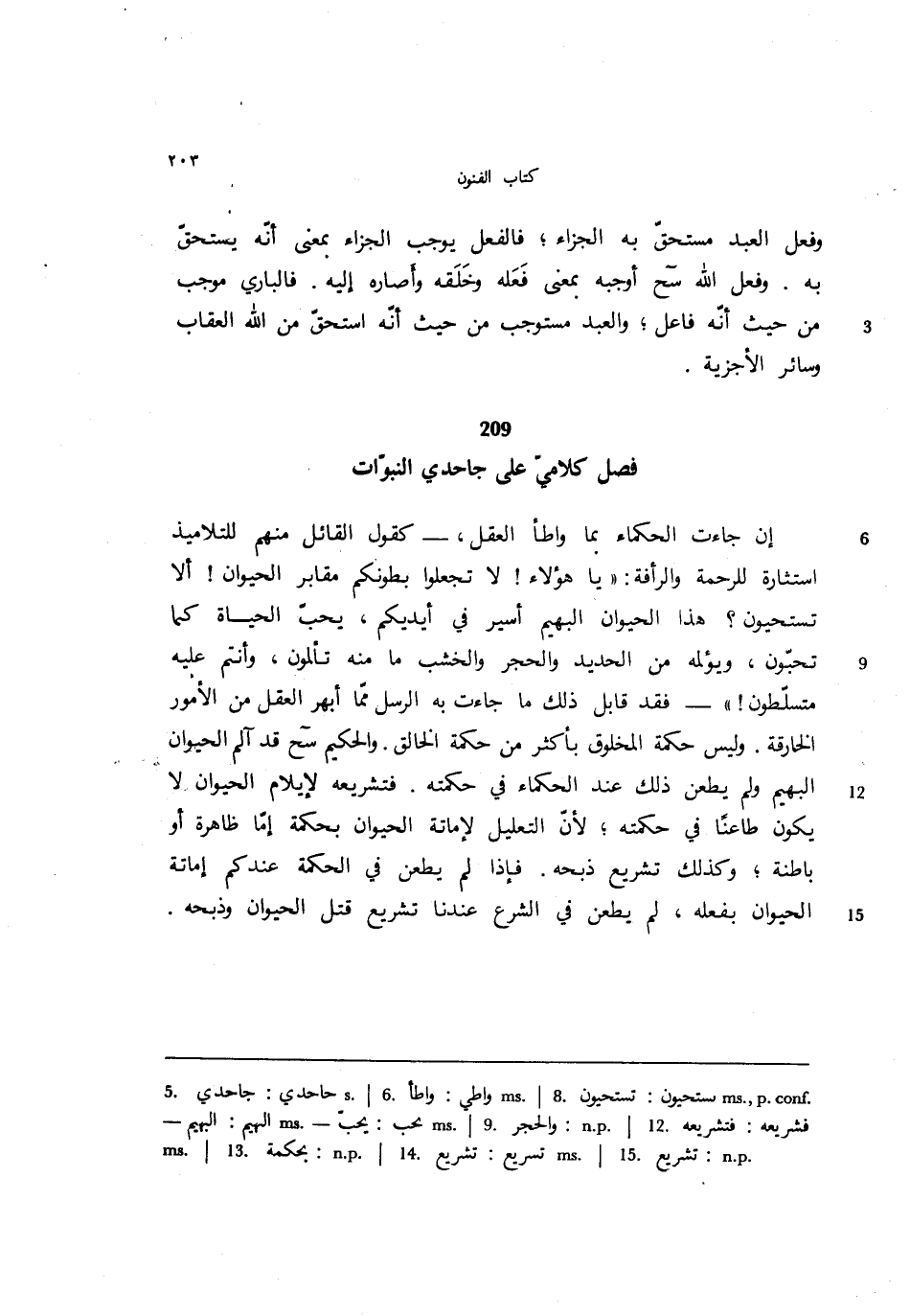 إن جاء الحكماء بما واطأ العقل، كقول القائل منهم للتلاميذ استثارة للرحمة والرأفة: ((يا هؤلاء! لا تجعلوا بطونكم مقابر الحيوان! ألا تستحون؟ هذا الحيوان البهيم أسير في أيديكم، يحب الحياةكما تحبون، ويؤلمه من الحديد والحجر والخشب ما منه تألمون، وأنتم عليه متسلطون! )) فقد قابل ذلك ما جاءت به الرسل مما أبهر العقل من الأمور الخارقة. وليس حكمة المخلوق بأكثر من حكمة الخالق. والحكيم سح قد آلم الحيوان البهيم ولم يطعن ذلك عند الحكماء في حكمته. فتشريعه لإيلام الحيوان لا يكون طاعنًا في حكمته؛ لأن التعليلي لإماتة الحيوان بحكمة إما ظاهرة أو باطنة؛ وكذلك تشريع ذبحه. فإذا لم يطعن في الحكمة عندكم إماتة الحيوان يفعله، لم يطعن في الشرع عندنا تشريع قتل الحيوان وذبحه.