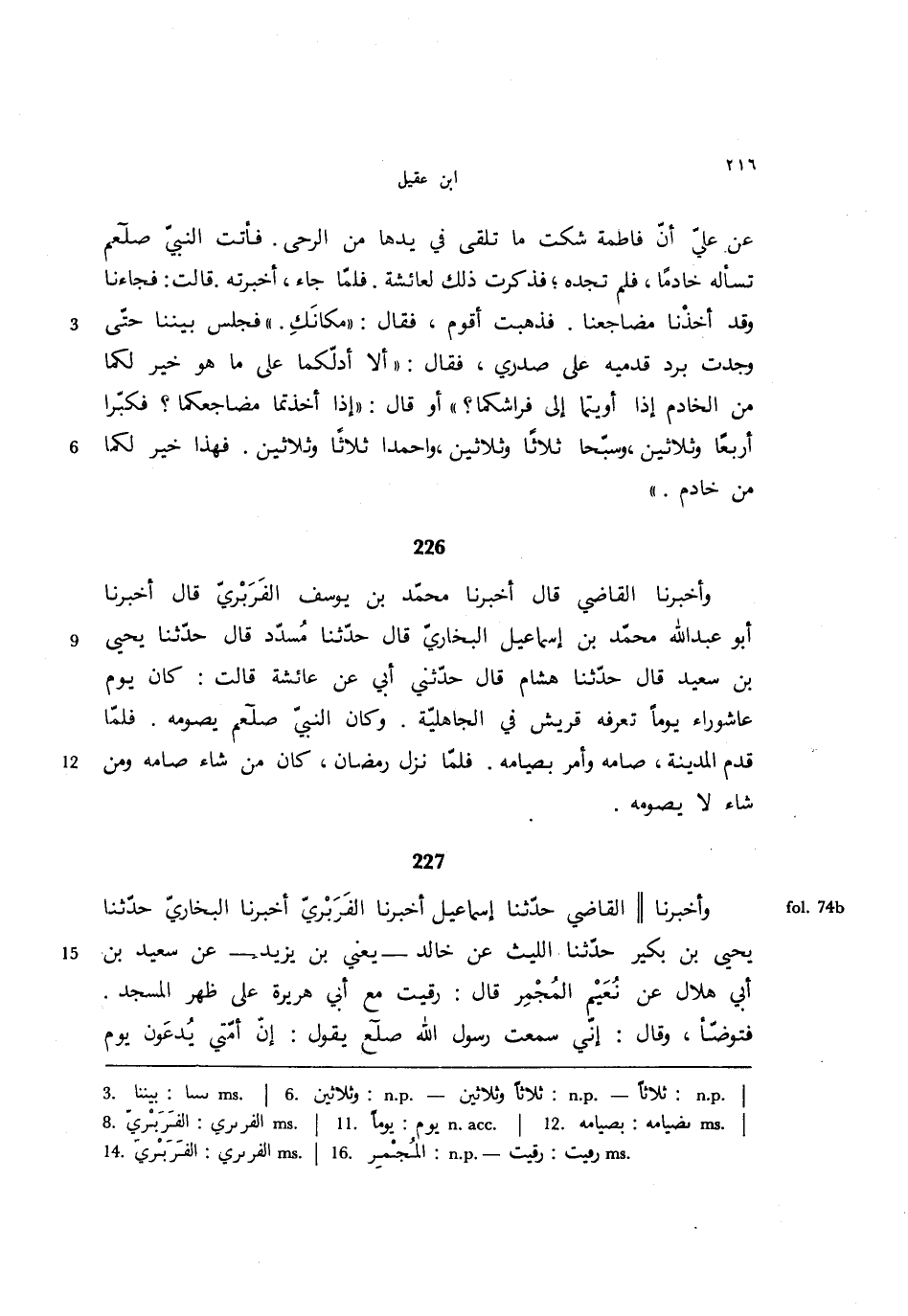 226 - وأخبرنا القاضي قال أخبرنا محمد بن يوسف الفربري قال أخبرنا أبو عبد الله محمد بن إسماعيل البخاري قال حدثنا مسدد قال حدثنا يحيى بن سعيد قال حدثنا هشام قال حدثني أبي عن عائشة قالت: كان يوم عاشوراء يومًا تعرفه قريش في الجاهلية. وكان النبي صلعم يصومه. فلما قدم المدينة، صامه وأمر بصيامه. فلما نزل رمضان، كان من شاء صامه ومن شاء لا يصومه.