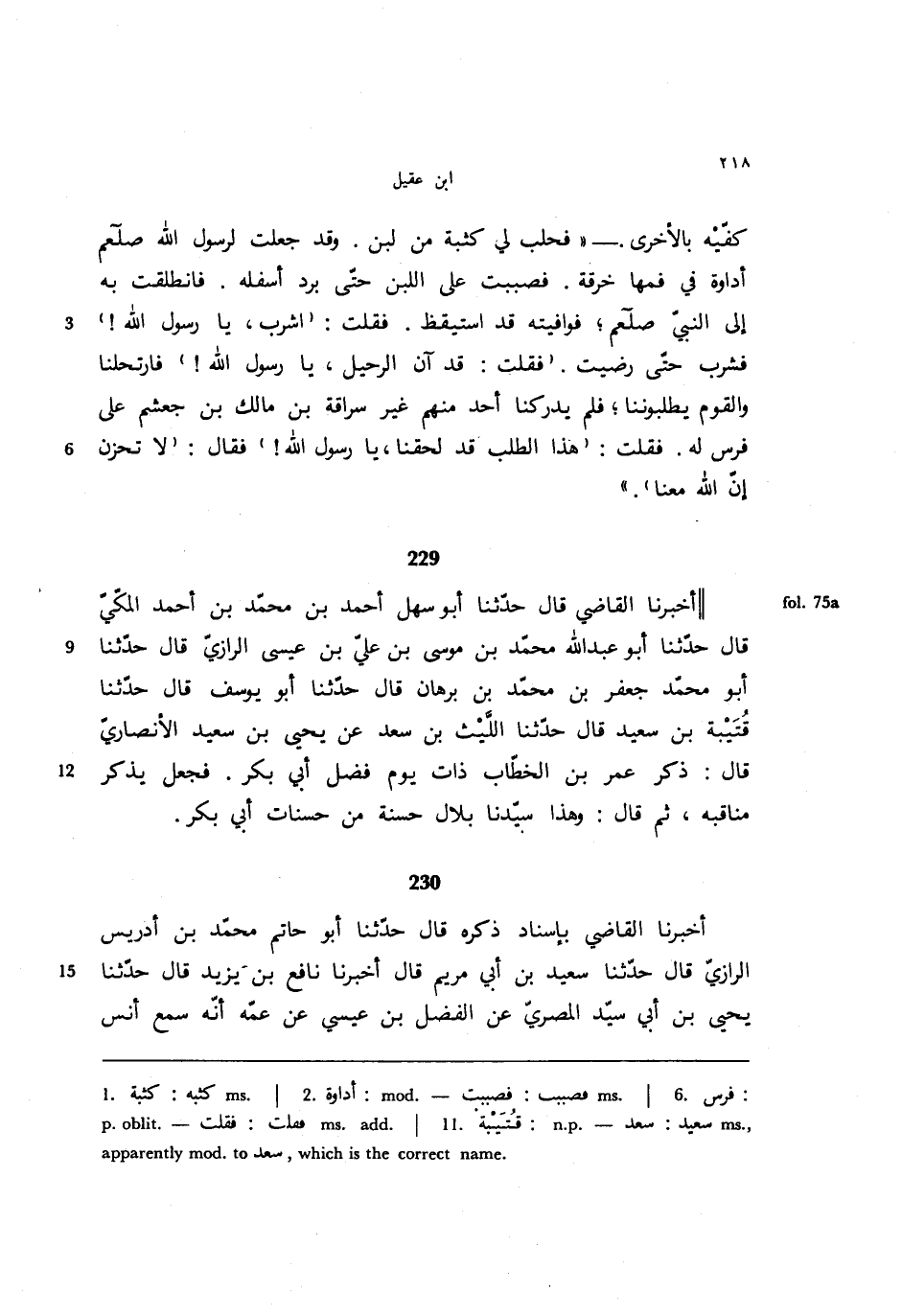 كفيه بالأخرى. - ((فحلب لي كثبة من لبن. وقد جعلت لرسول الله أداوة في فمها خرقة. فصببت على اللبن حتى برد أسفله. فانطلقت به إلى النبي صلعم؛ فوافيته قد استيقظ. فقلت: ((اشرب، يا رسول الله! )) فشرب حتى رضيت. ((فقت: قد آن الرحيل، يا رسول الله! )) فارتلحنا والقوم يطلبوننا؛ فلم يدركنا أحد منهم غير سراقة بن مالك بن جعشم على فرس له. فقلت: ((هذا الطلب قد لحقنا، يا رسول الله! )) فقال: ((لا تحزن إن الله معنا)).