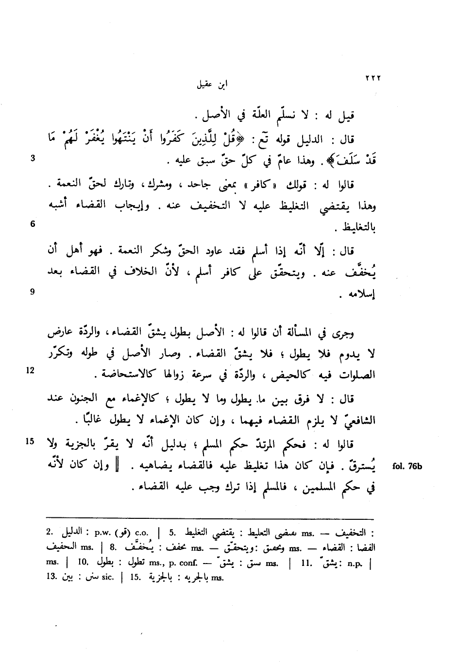 وجرى في المسألة أن قالوا له: الأصل بطول يشق القضاء، والردة عارض لا يدوم فلا يطول؛ فلا يشق القضاء. وصار الأصل في طوله وتكرر العمليات فيه كالحيض، والردة في سرعة زوالها كالاستخاضة.