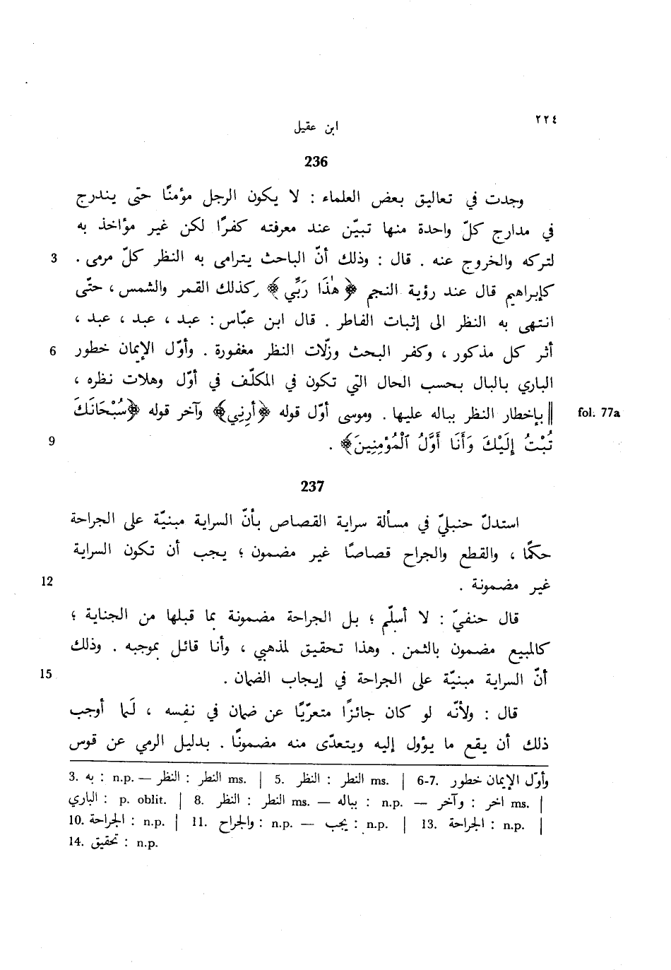 236 - وجدت في تعاليق بعض العلماء: لا يكون الرجل مؤمناً حتى يندرج في مدارج كل واحدة منها تبين عند معرفته كفراً لكن غير مؤاخذ به لتركه والخروج عنه. قال: وذلك أن الباحث يترامى به النظر كل مرمى كإبراهيم قال عند رؤية النجم {هذا ربي} وكذلك القمر والشمس، حتى انتهى به النظر إلى إثبات الفاطر. قال ابن عباس: عبد، عبد، عبد، أثر كل مذكور، وكفر البحث وزلات النظر مغفورة. وأول الإيمان خطور الباري بالبال بحسب الحال التي تكون في المكلف في أول وهلات نظره، بإخطار النظر بباله عليها. وموسى أول قوله {أرني} وآخر قوله {سبحانك تبت إليك وأنا أول المؤمنين}.
