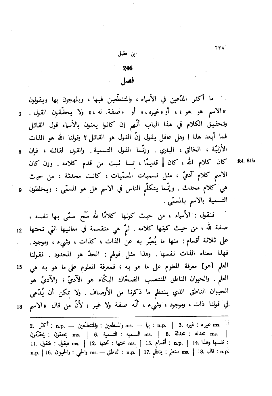 ما أكثر المدعين في الأسماء، والمتنطعين فيها، ويلهجون بها ويقولون ((الاسم هو هو))، أو ((غيره)) أو ((صفة له)) ولا يحققون القول. وتحقيق الكلام في هذا الباب أنهم إن كانوا يعنون بالأسماء قول القائل فما أبعد هذا! وهل عاقل يقول إن القول هو القائل؟ وقولنا الله هو الذات الأزلية، الخالق، الباري. وإنما القول التسمية. والقول لقائله؛ فإن كان كلام الله، كان قديماً، بما ثبت من قدم كلامه. وإن كان الاسم كلام آدمي، مثل تسميات المسميات، كانت محدثة، من حيث هي كلام محدث. وإنما يتكلم الناس في الاسم هل هو المسمى، ويخلطون التسمية بالاسم بالمسمى.