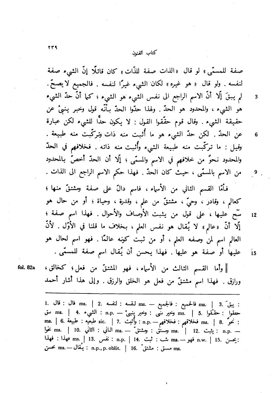فأما القسم الثاني من الأسماء، فاسم دال على صفة ومشتق منها؛ كعالم، وقادر، وحي، مشتق من علم، وقدرة، وحياة؛ أو من حال هو سح عليها، على قول من يثبت الأوصاف والأحوال. فهذا اسم صفة؛ إلا أن ((عالم)) لا يقال هو نفس العلم، بخلاف ما قلنا في الأول. لأن العالم اسم لمن وصفه العلم، أو من ثبت كونه عالماً. فهو اسم لحال هو عليها أو صفة هو عليها. فهذا يحسن أن يقال اسم صفة للمسمى.