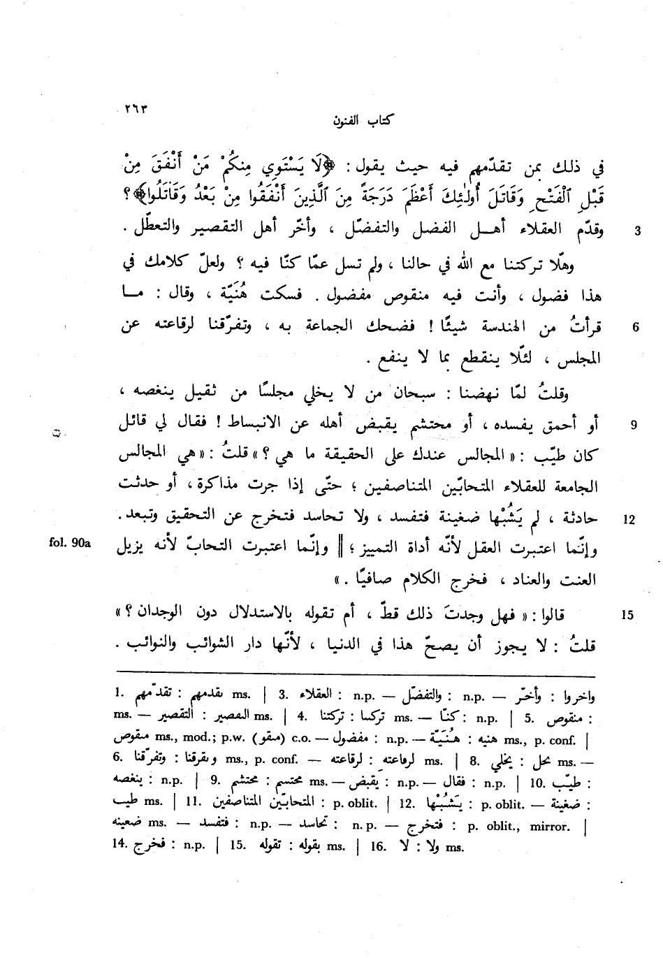وقلت لما نهضنا: سبحان من لا يخلي مجلسًا من ثقيل ينغصه، أو أحمق يفسده، أو محتشم يقبض أهله عن الانبساط! فقال لي قائل كان طيب: ((المجالس عندك على الحقيقة ما هي؟ )) قلت: ((هي المجالس الجامعة للعقلاء المتحابين المتناصفين؛ حتى إذا جرت مذاكرة، أو حدثت حادثة، لم يشبها ضغينة فتفسد، ولا تحاسد فتخرج عن التحقيق وتبعد. وإنما اعتبرت العقل لأنه أداة التمييز؛ ||وإنما اعتبرت التحاب لأنه يزيل العنت والعناد، فخرج الكلام صافيًا.))