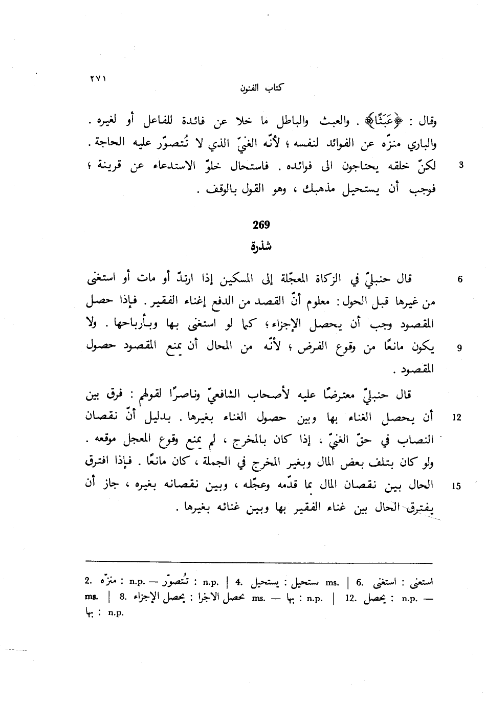 قال حنبلي معترضًا عليه لأصحاب الشافعي وناصرًا لقولهم: فرق بين أن يحصل الغناء بها وبين حصول الغناء بغيرها. بدليل أن نقصان النصاب في حق الغني، إذا كان بالمخرج، لم يمنع وقوع المعجل موقعه. ولو كان بتلف بعض المال وبغير المخرج في الجملة، كان مانعًا. فإذا افترق الحال بين نقصان المال بما قدمه وعجله، وبين نقصانه بغيره، جاز أن يفترق الحال بين غناء الفقير بها وبين غنائه بغيرها.