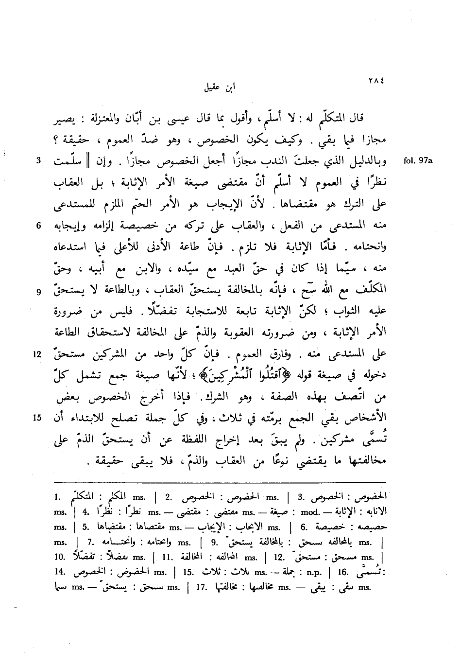 قال المتكلم له: لا أسلم، وأقول بما قال عيسى بن أبان والمعتزلة: يصير مجازًا فيما بقي. وكيف يكون الخصوص، وهو ضد العموم، حقيقة؟ وبالدليل الذي جعلت الندب مجازًا أجعل الخصوص مجازًا. وإن ||سلمت نظرًا في العموم لا أسلم أن مقتضى صيغة الأمر الإثابة؛ بل العقاب على الترك هو مقتضاها. لأن الإيجاب هو الأمر الحتم الملزم للمستدعى منه المستدعى من الفعل، والعقاب على تركه من خصيصة إلزامه وإيجابه وانحتامه. فأما الإثابة فلا تلزم. فإن طاعة الأدنى للأعلى فيما استدعاه منه، سيما إذا كان في حق العبد مع سيده، والابن مع أبيه، وحق المكلف مع الله سح، فإنه بالمخالفة يستحق العقاب، وبالطاعة لا يستحق عليه الثواب؛ لكن الإثابة تابعة للاستجابة تفضلاً. فليس من ضرورة الأمر الإثابة، ومن ضرورته العقوبة والذم على المخالفة لاستحقاق الطاعة على المستدعى منه. وفارق العموم. فإن كل واحد من المشركين مستحق دخوله في صيغة قوله {اقتلوا المشركين}؛ لأنها صيغة جمع تشمل كل من اتصف بهذه الصفة، وهو الشرك. فإذا أخرج الخصوص بعض الأشخاص بقي الجمع برمته في ثلاث، وفي كل جملة تصلح للابتداء أن تسمى مشركين. ولم يبق بعد إخراج اللفظة عن أن يستحق الذم على مخالفتها ما يقتضي نوعًا من العقاب والذم، فلا يبقى حقيقة.