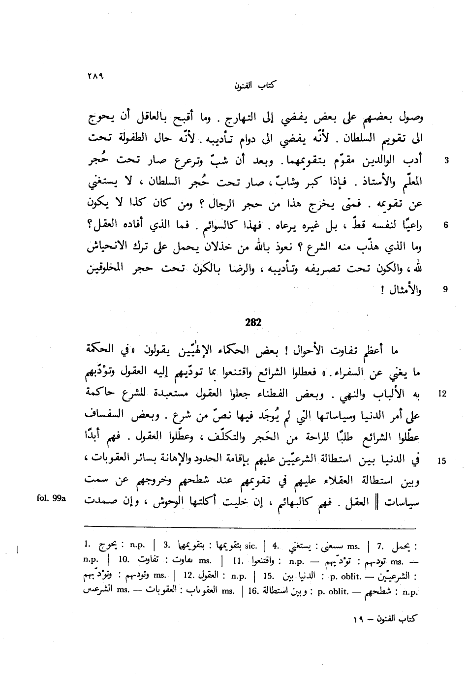 282 - ما أعظم تفاوت الأحوال! بعض الحكماء الإلهيين يقولون ((في الحكمة ما يغني عن السفراء.)) فعطلوا الشرائع واقتنعوا بما توديهم إليه العقول وتؤديهم به الألباب والنهي. وبعض الفطناء جعلوا العقول مستبعدة للشرع حاكمة على أمر الدنيا وسياساتها التي لم يوجد فيها نص من شرع. وبعض السفاف عطلوا الشرائع طلبًا للراحة من الحجر والتكلف، وعطلوا العقول. فهم أبدًا في الدنيا بين استطالة الشرعيين عليهم بإقامة الحدود والإهانة بسائر العقوبات، وبين استطالة العقلاء عليهم في تقويمهم عند شطحهم وخروجهم عن سمت سياسات || العقل. فهم كالبهائم، إن خليت أكلتها الوحوش، وإن صمدت