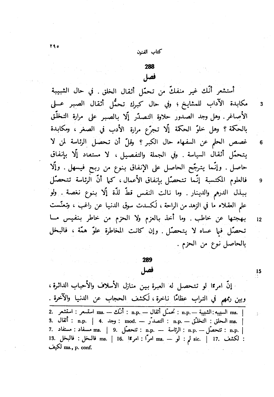 أستشعر أنك غير منفك من تحمل أثقال الخلق. في حال الشبيبة مكايدة الآداب للمشايخ؛ وفي حال كبرك تحمل أثقال الصبر على الأصاغر. وهل وجد الصدور حلاوة التصدر إلا بالصبر على مرارة التخلق بالحكمة؟ وهل خلو الحكمة إلا تجرع مرارة الأدب في الصغر، ومكابدة غصص الحلم عن السفهاء حال الكبر؟ وقال أن تحصل الرئاسة لمن لا يتحمل أثقال السياسة. وفي الجملة والتفصيل، لا مستفاد إلا باتفاق حاصل. وإنما يترجح الحاصل على الإنفاق بنوع من ربح فيسهل. وإلا فالعلوم المكتسبة إنما تتحصل بإنفاق الأعمال، كما أن الرئاسة تتحصل ببذل الدرهم والدينار. وما نالت النفس قط لذة إلا بنوع نغصه. ولو علم العقلاء ما في الزهد من الراحة، لكسدت سوق الدنيا عن راغب، وتعنست بهجتها عن خاطب. وما أخذ بالعزم ولا الحزم من خاطر بنفيس ما تحصل فيما عساه لا يتحصل. وإن كانت المخاطرة علو همة، فالبخل بالحاصل نوع من الحزم