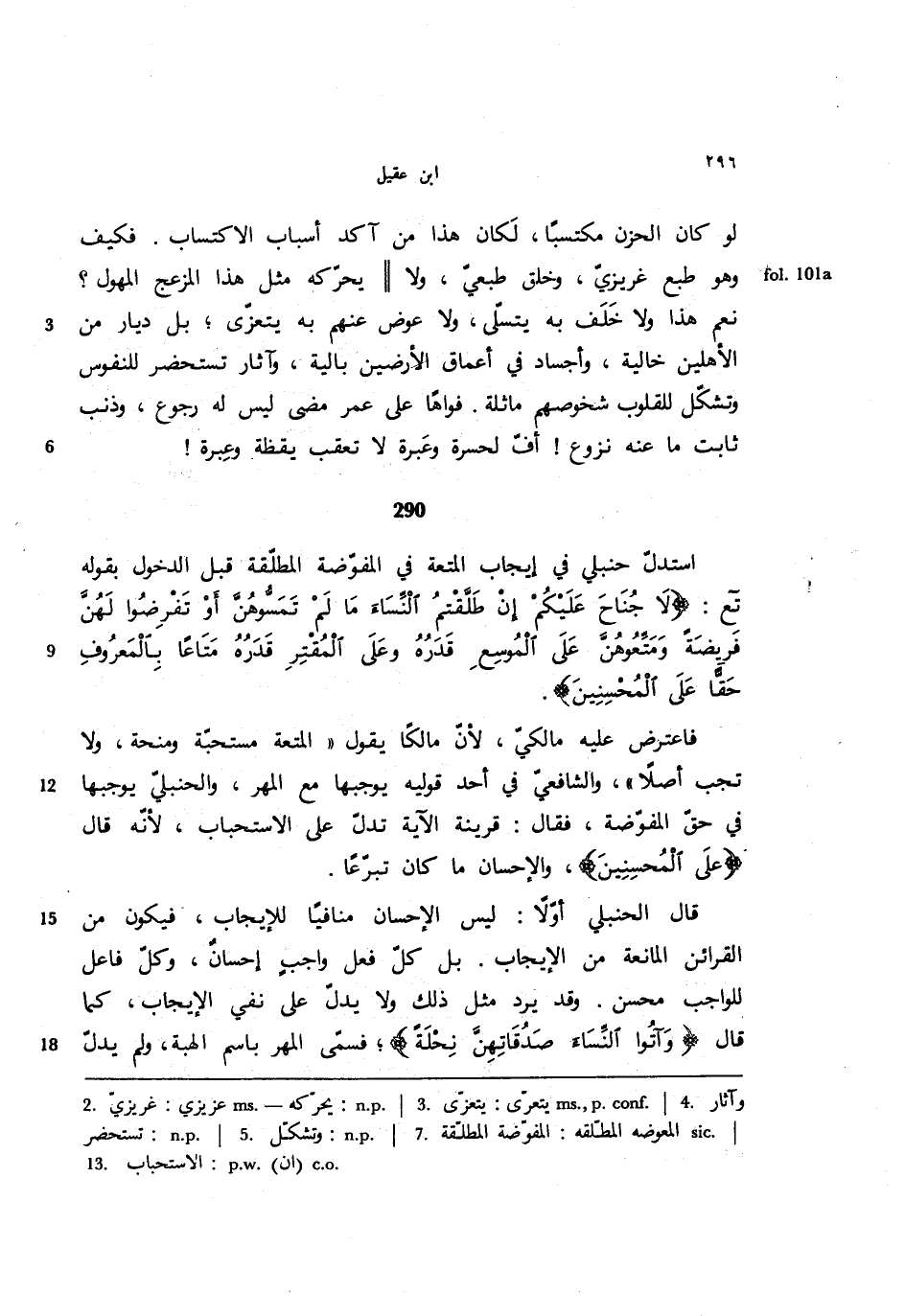 290 - استدل حنبلي في إيجاب المتعة في المفوضة المطلقة قبل الدخول بقوله تع: {لا جناح عليكم إن طلقتم النساء ما لم تمسوهن أو تفرضوا لهن فريضة ومتعوهن على الموسع قدره وعلى المقتر قدره متاعا بالمعروف حقا على المحسنين}.