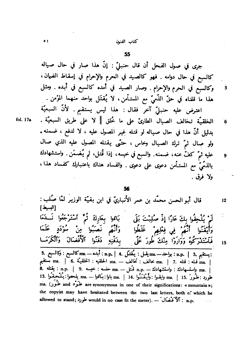 55 - جرى في صول الفحل أن قال حنبلي: إن هذا صار في حال صياله كالسبع في حال دوامه. فهو كالصيد في الحرم والإحرام في إسقاط الضمان، وكالسبع في الحرم والإحرام. وصار الصيد في أمده كالسبع في أبده. ومثل هذا ما قلناه في حق الذمي مع المستأمن، لا يقتل بواحد منهما المؤمن.