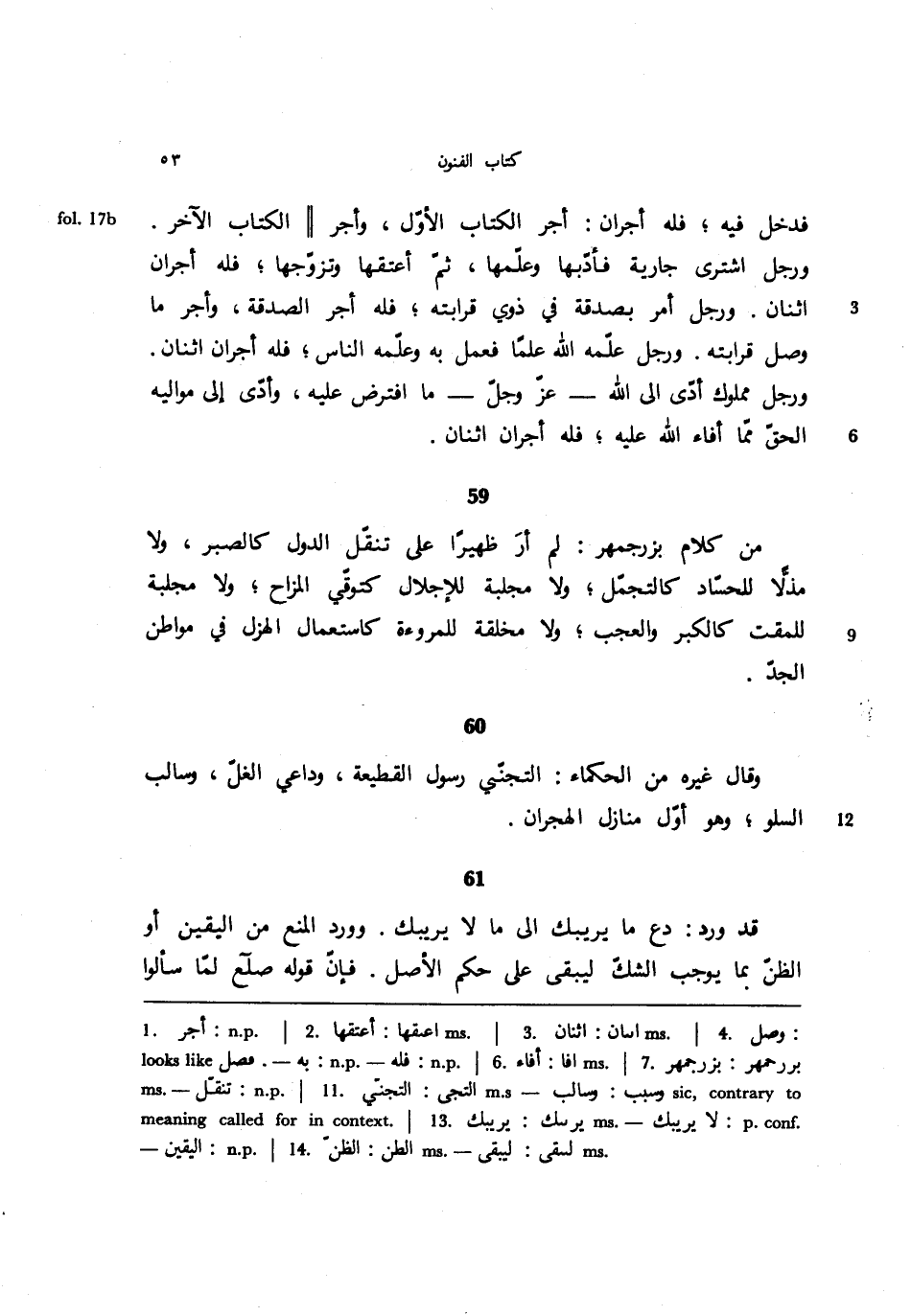 59 - من كلام بزرجمهر: لم أر ظهيراً على تنقل الدول كالصبر، ولا مذلاً للحساد كالتجمل؛ ولا مجلبة للإجلال كتوقي المزاح؛ ولا مجلبة للمقت كالكبر والعجب؛ ولا مخلقة للمروءة كاستعمال الهزل في مواطن الجد.