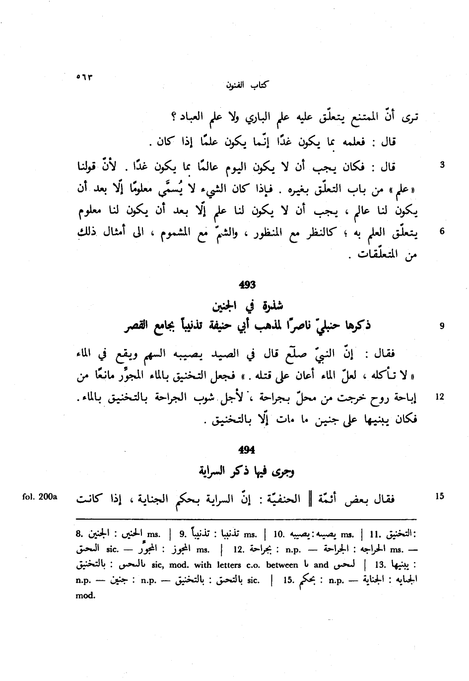 فقال: إن النبي صلى الله عليه وسلم قال في الصيد يصيبه السهم ويقع في الماء "لا تأكله, لعل الماء أعان على قتله." فجعل التخنيق بالماء المجور مانعًا من إباحة روح خرجت من محل بجراحة, لأجل شوب الجراحة بالتخنيق بالماء. فكان يبنيها على جنين ما مات إلا بالتخنيق.
