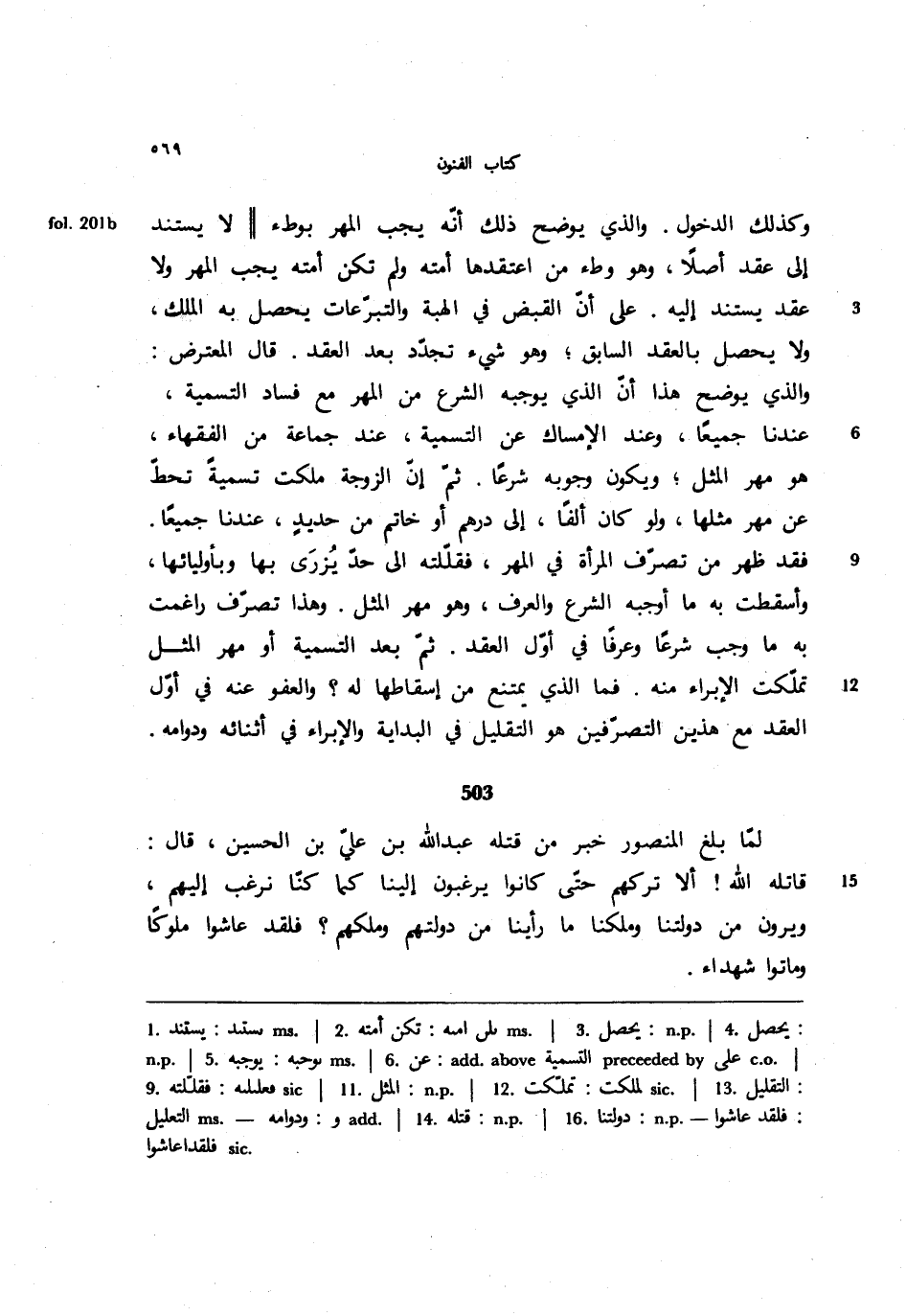 503 - لما بلغ المنصور خبر من قتله عبد الله بن علي بن الحسين, قال: قاتله الله! ألا تركهم حتى كانوا يرغبون إلينا كما كنا نرغب إليهم, ويرون من دولتنا وملكنا ما رأينا من دولتهم وملكهم؟ فلقد عاشوا ملوكًا وماتوا شهداء.
