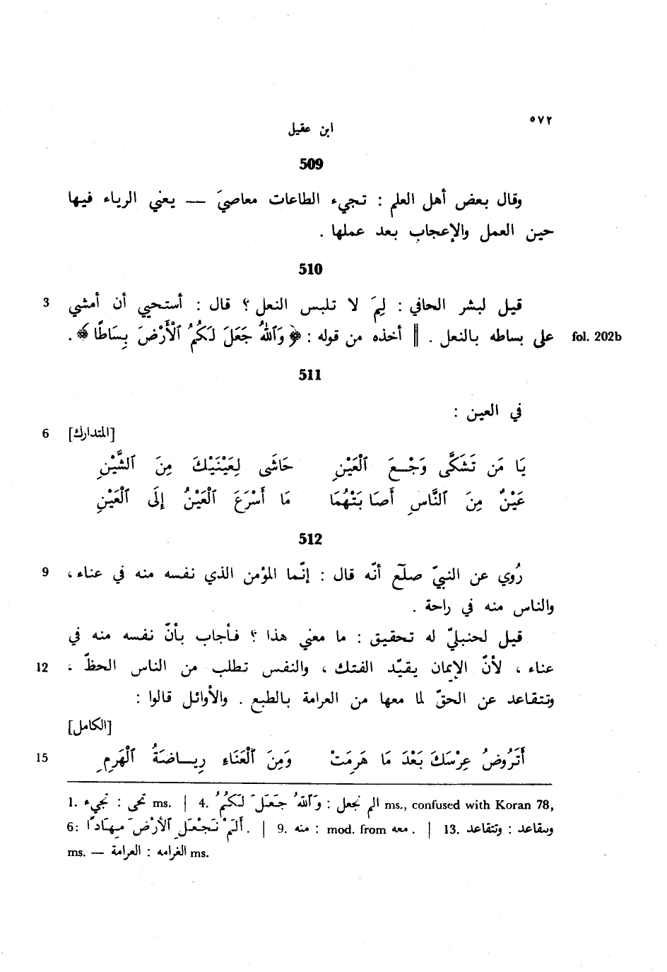 510 - قيل لبسر الحافي: لم لا تلبس النعل؟ قال: أستحي أن أمشي على بساطة بالنعل. أخذه من قوله: (والله جعل لكم الأرض بساطا)