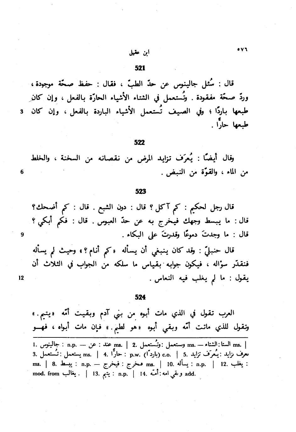 521 - قال: سئل جالينوس عن حد الطب, فقال: حفظ صحة موجودة, ورد صحة مفقودة. وتستعمل في الشتاء الأشياء الحارة بالفعل, وإن كان طبعها باردًا؛ وفي الصيف تستعمل الأشياء الباردة بالفعل, وإن كان طبعها حارًا.