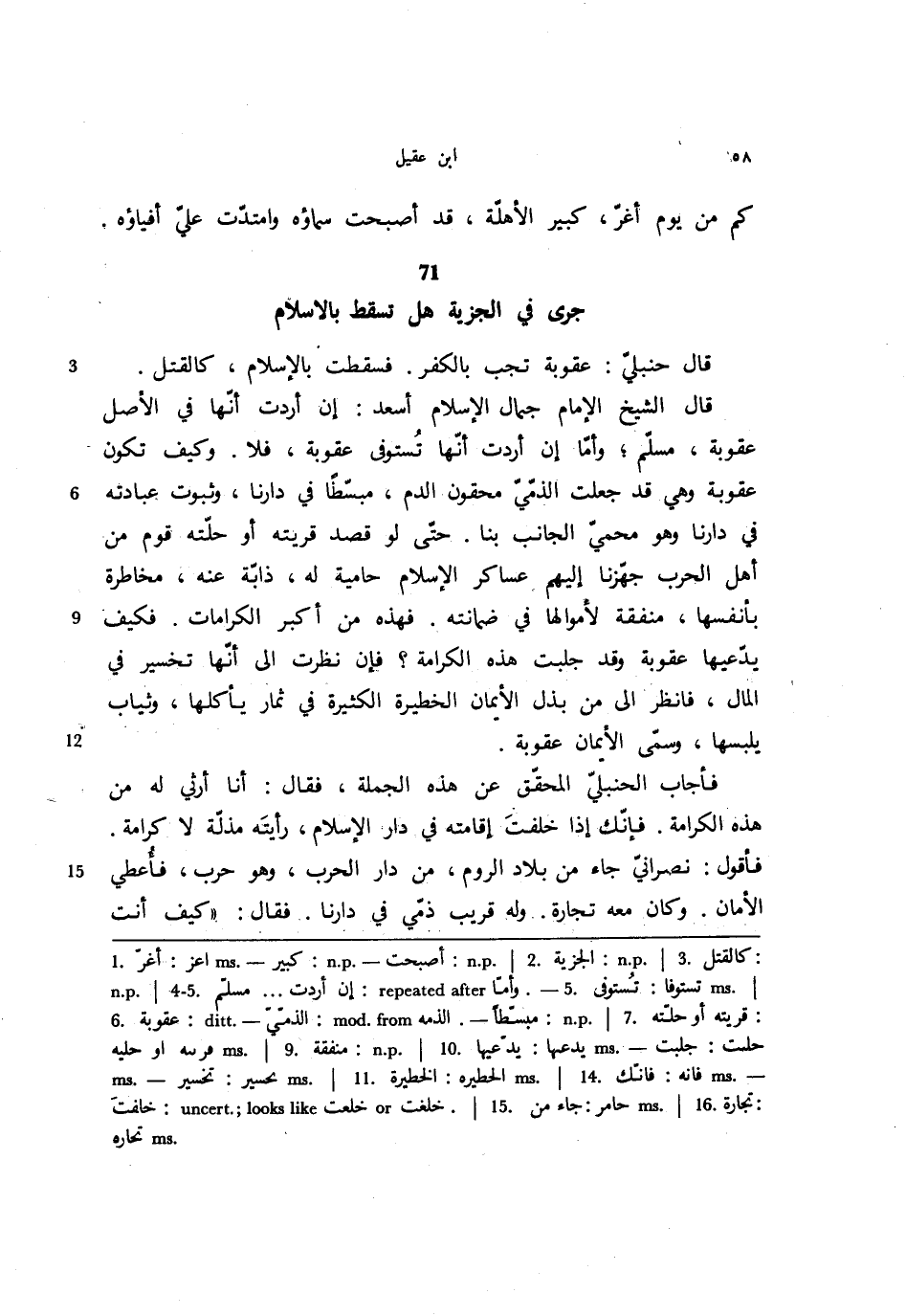 فأجاب الحنبلي المحقق عن هذه الجملة، فقال: أنا أرثي له من هذه الكرامة. فإنك إذا خلفت إقامته في دار الإسلام، رأيته مذلة لا كرامة. فأقول: نصراني جاء من بلاد الروم، من دار الحرب، وهو حرب، فأعطي الأمان. وكان معه تجارة. وله قريب ذمي في دارنا. فقال: ((كيف أنت
