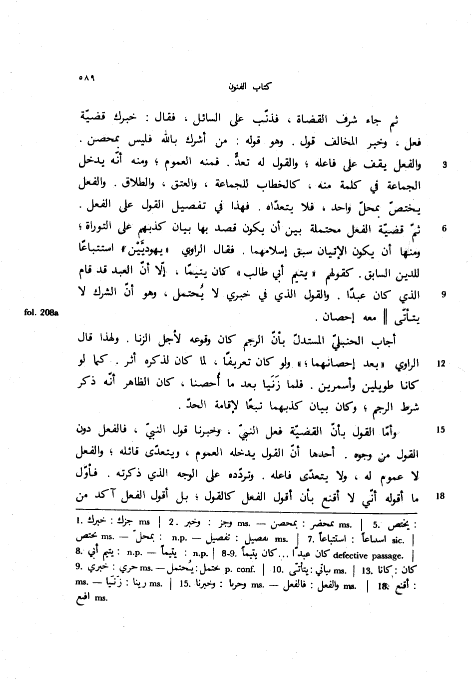 ثم جاء شرف القضاة, فذنب على السائل, فقال: خبرك قضية فعل, وخبر المخالف قول. وهو قوله: من أشرك بالله فليس بمحصن. والفعل يقف على فاعله؛ والقول لم تعد. فمنه العموم؛ ومنه أنه يدخل الجماعة في كلمة منه, كالخطاب للجماعة, والعتق, والطلاق. والفعل يختص بمحل واحد, فلا يتعداه. فهذا في تفصيل القول على الفعل. ثم قضية الفعل محتملة بين أن يكون قصد بها بيان كذبهم على التوراة؛ ومنها أن يكون الإتيان سبق إسلامهما. فقال الراوي "يهوديين" استتباعا للدين السابق. كقولهم "يتيم أبي طالب" كان يتيما, إلا أن العبد قد قام الذي كان عبدا. والقول الذي في خيري لا يحتمل, وهو أن الشرك لا يتأتى معه إحصان.