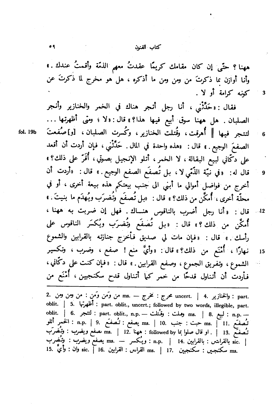 فقال: ((حدثني، أنا رجل أتجر هناك في الخمر والخنازير وأنجر الصلبان. هل ههنا سوق أبيع فيها هذا؟ )) قال: ((لا؛ ومتى أظهرتها ... لتتجر فيها? أهرقت، وقتلت الخنازير، وكسرت الصلبان، [و] صفعت الصفع الوجيع.)) قال: ((هذه واحدة في المال. حدثني، فإن أردت أن أقعد على دكاني لبيع البقالة، لا الخمر، أتلو الإنجيل بصوتي، أقر على ذلك؟ )) قال له: ((في نية الذمي لا، بل تصفع الصفع الوجيع.)) قال: ((أردت أن أخرج من فواضل أموالي ما أبني إلى جنب بيعتكم هذه بيعة أخرى، أو في محلة أخرى، أمكن من ذلك؟ )) قال: ((بل تصفع وتضرب ويهدم ما بنيت.)) قال: ((أنا رجل أضرب بالناقوس هناك. فهل إن ضربت به ههنا، أمكن من ذلك؟ )) قال: ((بل تصفع وتضرب ويكسر الناقوس على رأسك.)) قال: ((فإن مات لي صديق فأخرج جنازته بالقرابين والشموع نهاراً، أمنع من ذلك؟ )) قال: ((وأي منع! صفع، وضرب، وتكسير الشموع، وتفريق الجموع، وصفع القرابين.)) قال: ((فإن كنت على دكاني، فأردت أن أتناول قدحاً من خمر كما أتناول قدح سكنجبين، أمنع من