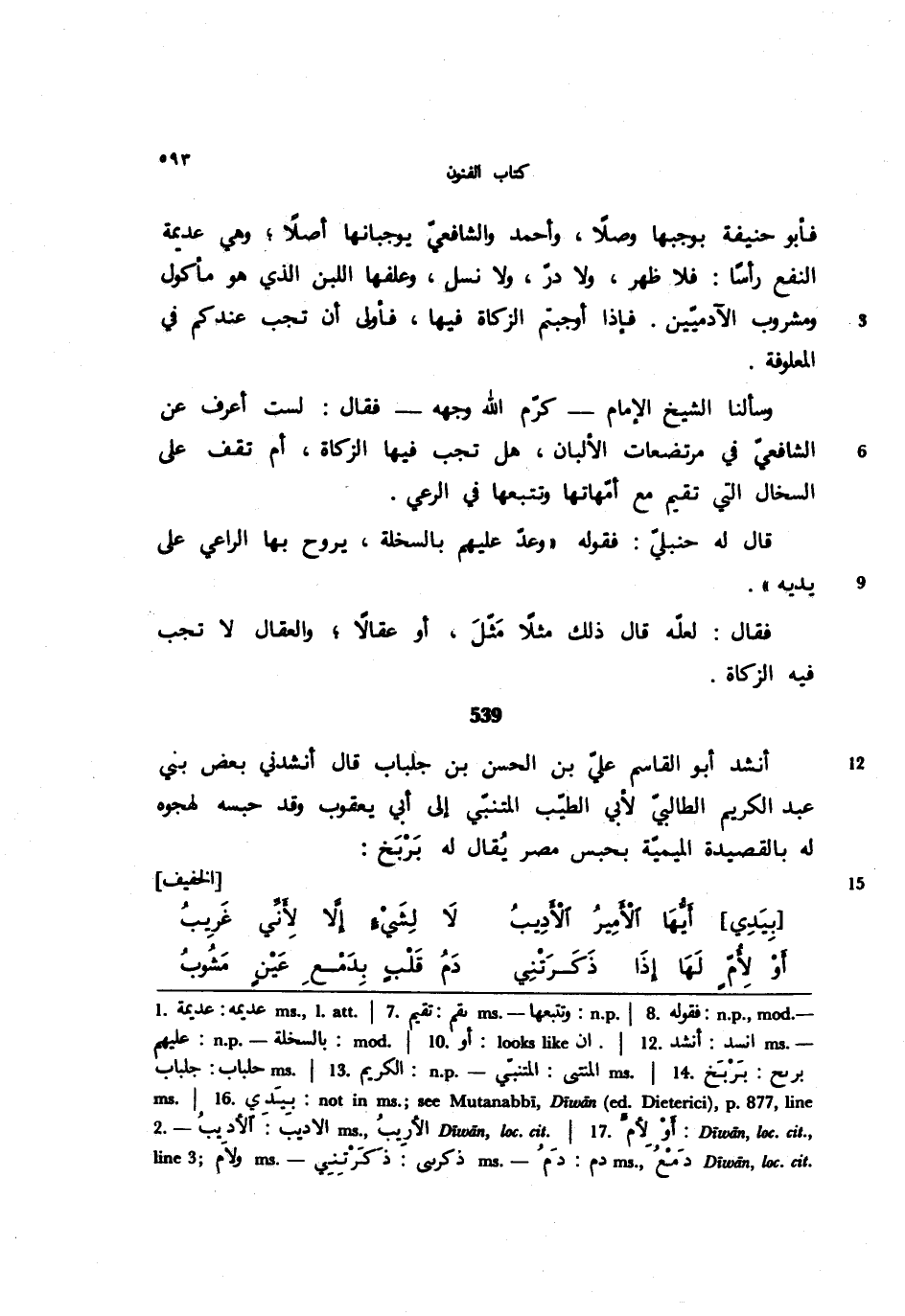 539 - أنشد أبو القاسم علي بن الحسن بن جلباب قال أنشدني بعض بني عبد الكريم الطالبي لأبي الطيب المتنبي إلى أبي يعقوب وقد حبسه لهجوه له بالقصيدة الميمية بحبس مصر يقال له بربخ: