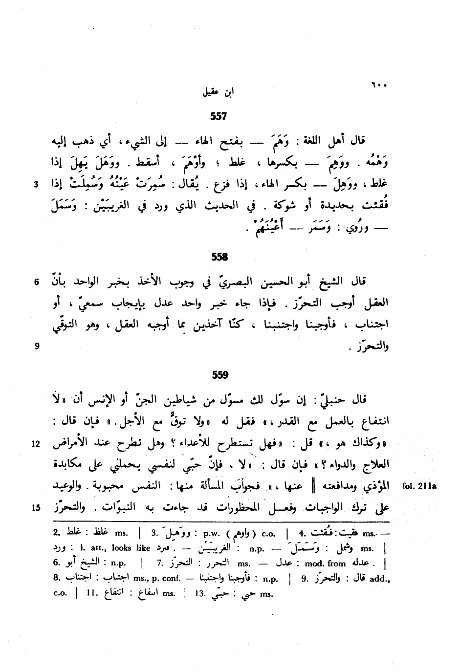 557 - قال أهل اللغة: وهم - بفتح الهاء - إلى الشئ، أي ذهب إليه وهمه. ووهم - بكسرها، غلط؛ وأوهم، أسقط. ووهل يهل إذا غلط، ووهل - بكسر الهاء، إذا فزع. يقال: سمرت عينه وسملت إذا فقئت بحديدة أو شوكة. في الحديث الذي ورد في الغريبين: وسمل - وروي: وسمر - أعينهم.