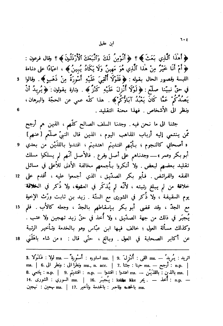 جئنا إلى ما نحن فيه. وجدنا السلف الصالح كلهم، الذين هم أرجح ممن ينتمي إليه أرباب المذاهب اليوم، الذين قال النبي - صلى الله عليه وسلم-[عنهم] ((أصحابي كالنجوم؛ بأيهم اقتديتم اهتديتم؛ اقتدوا باللذين من بعدي أبو بكر وعمر)) - وجدناهم على أصل وفرع. فالأصل أنهم لم يسلكوا مسلك تقليد بعضهم لبعض. ولا أنكروا بأجمعهم مخالفة الأدنى للأعلى في مسائل الفقه والفرائض. فأبو بكر الصديق، الذي أجمعوا عليه، أقدم على خلافة من لم يبلغ رتبته، لأنه لم يذكر في العشرة، ولا ذكر في الخلافة يوم السقيفة، ولا ذكر في الشورى مع الستة. زيد بن ثابت ورث الإخوة مع الجد، وقد قضى أبو بكر بإسقاطهم بالجد، وجعله كالأب. فلم يجبر في ذلك من جهة الصديق، ولا أخذ في حق زيد تهجين ولا عتب. وكذلك مسألة العول؛ خالف فيها ابن عباس وهو بالخدمة وتأخير الرتبة عن اكابر الصحابة في العول. وبالغ، حتى قال: ((من شاء باهلني