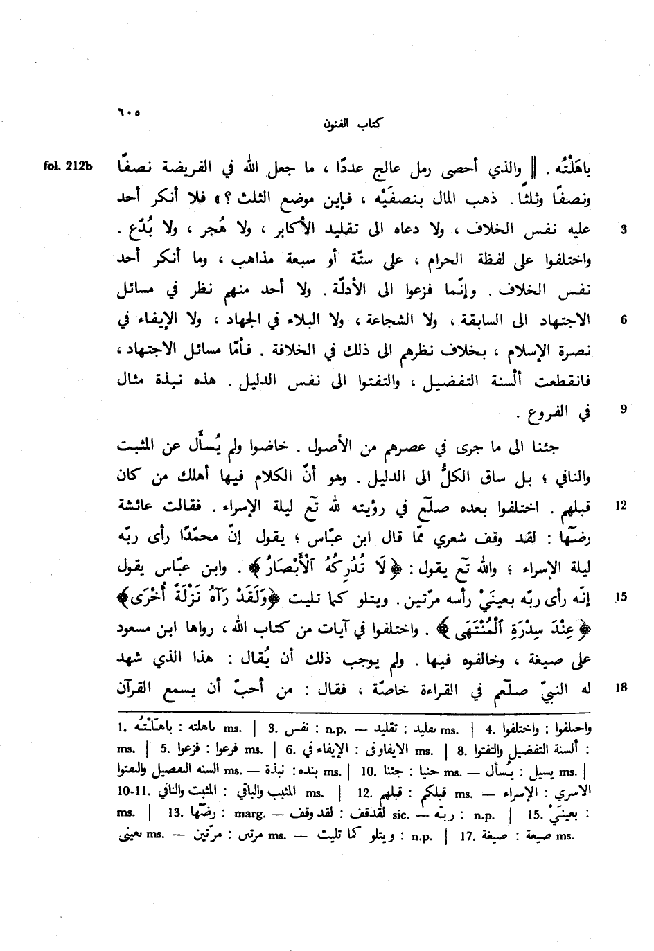 جئنا إلى ما جرى في عصرهم من الأصول. خاضوا ولم يسأل عن المثبت والنافي؛ بل ساق الكل إلى الدليل. وهو أن الكلام فيها أهلك من كان قبلهم. اختلفوا بعده - صلى الله عليه وسلم- في رؤيته لله - تعالى- ليلة الإسراء. فقالت عائشة - رضي الله عنها-: لقد وقف شعري مما قال ابن عباس؛ يقول إن محمدًا رأى ربه ليلة الإسراء؛ والله - تعالى- يقول: {لا تدركه الأبصار}. وابن عباس يقول إنه رأى ربه بعيني رأسه مرتين. ويتلو كما تليت {ولقد رآه نزلة أخرى} {عند سدرة المنتهى}. واختلفوا في آيات من كتاب الله، رواها ابن مسعود على صيغة، وخالفوه فيها. ولم يوجب ذلك أن يقال: هذا الذي شهد له النبي - صلى الله عليه وسلم- في القراءة خاصة، فقال: من أحب أن يسمع القرآن
