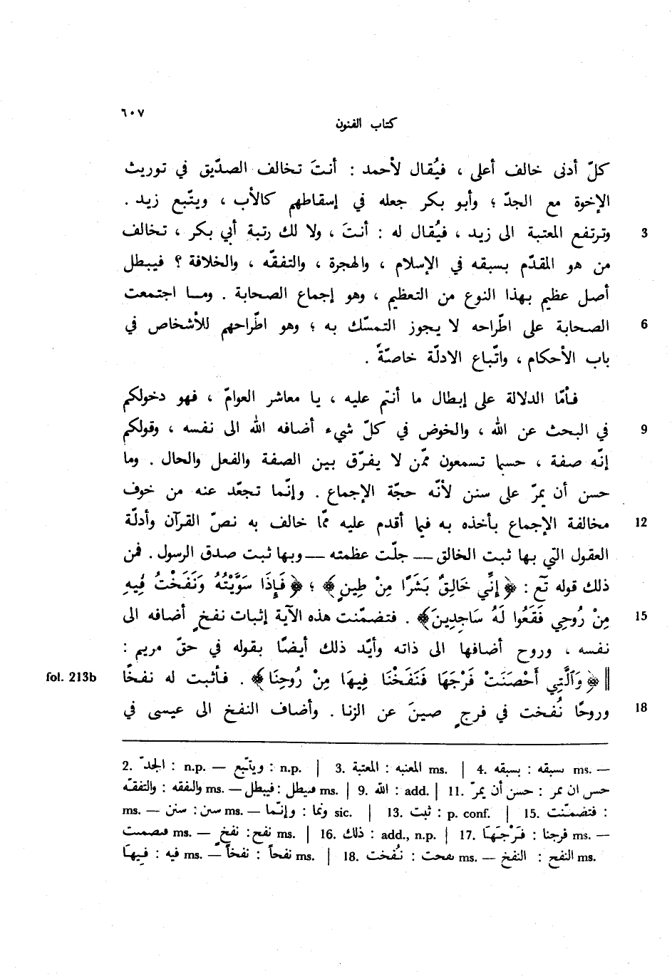 فأما الدلالة على إبطال ما أنتم عليه، يا معشر العوام، فهو دخولكم في البحث عن الله، والخوض في كل شئ أضافه الله إلى نفسه، وقولكم إنه صفة، حسبما تسمعون ممن لا يفرق بين الصفة والفعل والحال. وما حسن أن يمر على سنن لأنه حجة الإجماع. وإنما تجعد عنه من خوف مخالفة الإجماع بأخذه به فيما أقدم عليه مما خالف به نص القرآن وأدلة العقول التي بها ثبت الخالق - جلت عظمته - وبها ثبت صدق الرسول. فمن ذلك قوله - تعالى-: {إني خالق بشرًا من طين}؛ {فإذا سويته ونفخت فيه من روحي فقعوا له ساجدين}. فتضمنت هذه الآية إثبات نفخٍ أضافه إلى نفسه، وروح أضافها إلى ذاته وأيد ذلك أيضًا بقوله في حق مريم: (({والتي أحصنت فرجها فنفخنا فيها من روحنا}. فأثبت له نفخًا وروحًا نفخت في فرجٍ صين عن الزنا. وأضاف النفخ إلى عيسى في