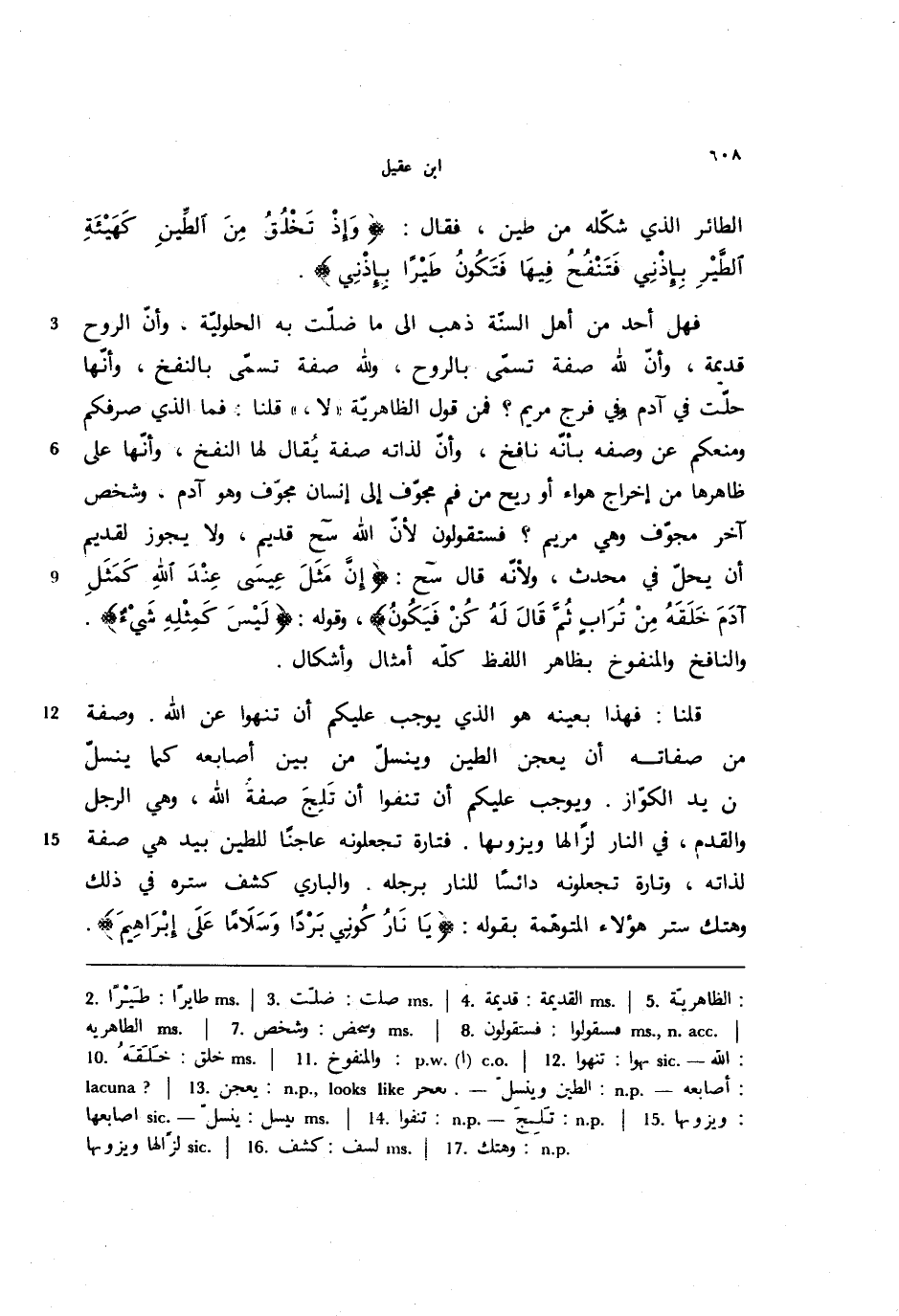 قلنا: فهذا بعينه هو الذي يوجب عليكم أن تنهوا عن الله. وصفة من صفاته أن يعجن الطين وينسل من بين أصابعه كما ينسل؟ ؟ يد الكواز. ويوجب عليكم أن تنفوا أن تلج صفة الله، وهي الرجل والقدم، في النار لزًا لها؟ ؟ . فتارة تجعلونه عاجنًا للطين بيد هي صفة لذاته، وتارة تجعلونه دائسًا للنار برجله. والباري كشف ستره في ذلك وهتك ستر هؤلاء المتوهمة بقوله: {يا نار كوني بردًا وسلامًا على إبراهيم}.