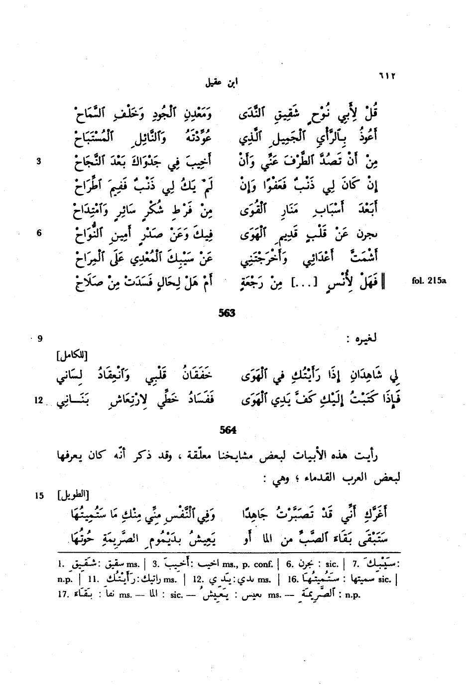 564 - رأيت هذه الأبيات لبعض مشايخنا معلقة، وقد ذكر أنه كان يعرفها لبعض العرب القداماء؛ وهي: