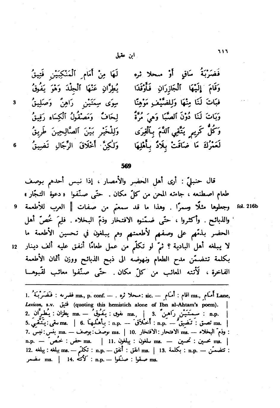 569 - قال حنبلي: أرى أهل الحضر والأمصار، إذا نبس أحدهم بوصف طعام اصطنعه، جاءته المحن من كل مكان. حتى صنفوا ((دعوة التجار)) وجعلوها مثلًا وسمرًا. وهذا ما قد سمعتم من صفات ((العرب للأطعمة والذبائح. وأكثروا، حتى ضمنوه الافتخار وذم البخلاء. فلم خص أهل الحضر بذمهم على وصفهم لأطعمتهم وهو يبلغون في تحسين الأطعمة ما لا يبلغه أهل البادية؟ ثم لو تكلم من عمل طعامًا أنفق عليه ألف دينار بكلمة تتضمن مدح الطعام ونهوضه إلى ذبح الذبائح ووزن أثمان الأطعمة الفاخرة، لأتته المعائب من كل مكان. حتى صنفوا معائب لقبوها