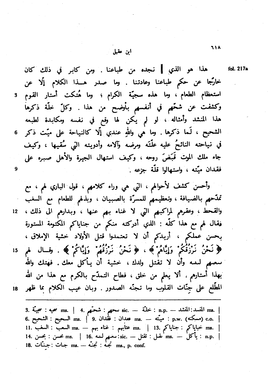 وأحسن كشف لأحوالهم، التي هي وراء كلامهم، قول الباري لهم، مع تمدحهم بالضيافة، وتعظيمهم للمسرة بالصبيان، وبذلهم للطعام مع السغب والقحط، وعقرهم لمراكبهم التي لا غناء بهم عنها، وبدارهم إلى ذلك، فقال لهم مع هذا كله: الذي أدركته منكم من جناياكم المكتومة المستورة بحسن عملكم، أريدكم أن لا تعتمدوا قتل الأولاد خشية الإملاق، {نحن نرزقكم وإياهم}، {نحن نرزقهم وإياكم}. وقال لهم؟ ؟ ؟ ؟ وأن لا تقتل ولدك، خشية أن يأكل معك. فهتك الله بهذا أستارهم، ألا يعلم من خلق، فطاح التمدح بالكرم مع هذا من الله المطلع على جنات القلوب وما تجنه الصدور. وبان عيب الكلام بما ظهر