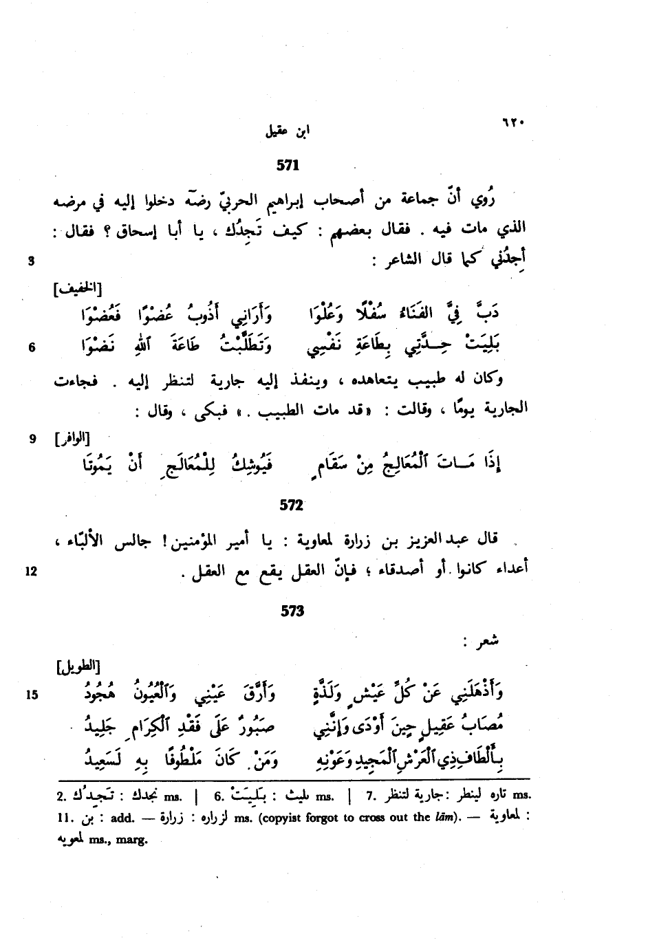 572 - قال عبد العزيز بن زارة لمعاوية: يا أمير المؤمنين! جالس الألباء، أعداء كانوا أو أصدقاء؛ فإن العقل يقع مع العقل.