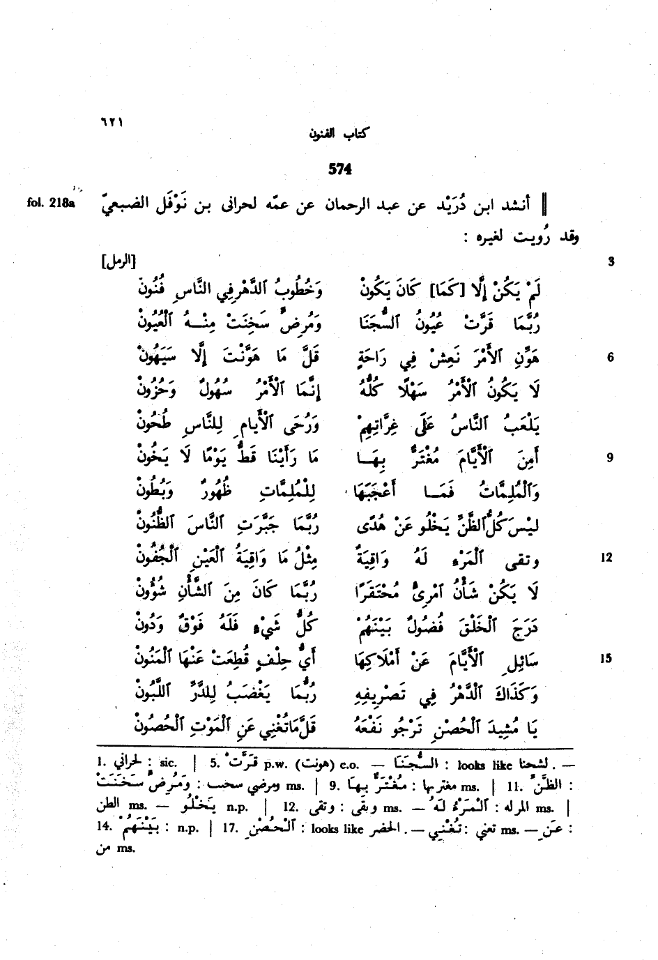 574 - ((أنشد ابن دريد عن عبد الحمان عن عمه لحراني بن نوفل الضبعي