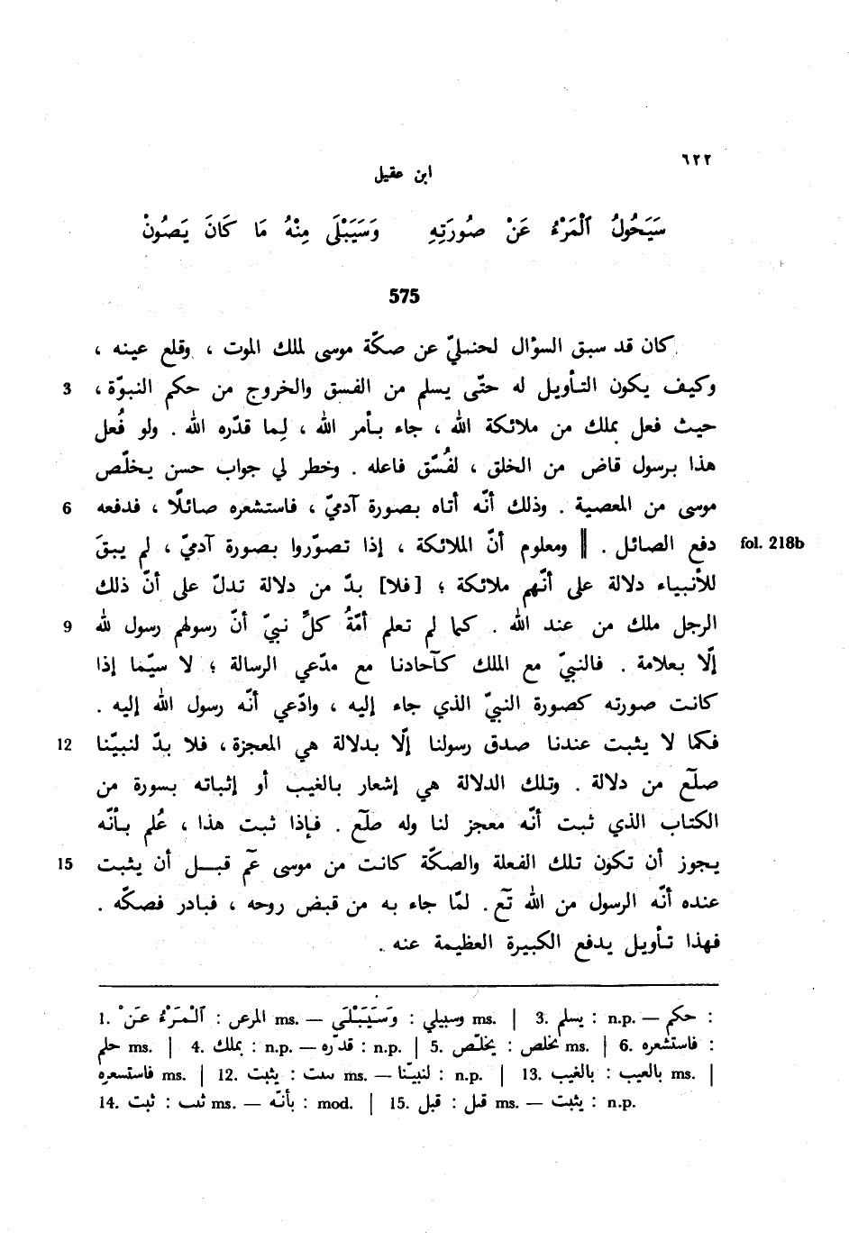 575 - كان قد سبق السؤال لحنبلي عن صكة موسى لملك الموت، وقلع عينه، وكيف يكون التأويل له حتى يسلم من الفسق والخروج من حكم النبوة، حيث فعل بملك من ملائكة الله، جاء بأمر الله، لما قدره الله. ولو فعل هذا برسول قاض من الخلق، لفسق فاعله. وخطر لي جواب حسن يخلص موسى من المعصية. وذلك أنه أتاه بصورة آدمي، فاستشعره صائلًا، فدفعه دفع الصائل. ((ومعلوم أن الملائكة، إذا تصوروا بصورة آدمي، لم يبق للأنبياء دلالة على أنهم ملائكة؛ [فلا] بد من دلالة تدل على أن ذلك الرجل ملك من عند الله. كما لم تعلم أمة كل نبي أن رسولهم رسول الله إلا بعلامة. فالنبي مع الملك كآحادنا مع مدعي الرسالة؛ لا سيما إذا كانت صورته كصورة النبي الذي جاء إليه، وادعي أنه رسول الله إليه. فكما لا يثبت عندنا صدق رسولنا إلا بدلالة هي المعجزة، فلا بد لنبينا - صلى الله عليه وسلم- من دلالة. وتلك الدلالة هي إشعار بالغيب أو إثباته بسورة من الكتاب الذي ثبت أنه معجز لنا وله - صلى الله عليه وسلم. فإذا ثبت هذا، علم بأنه يجوز أن تكون تلك الفعلة والصكة كانت من موسى - عليه السلام- قبل أن ثبت عنده أنه الرسول من الله - تعالى-. لما جاء به من قبض روحه، فبادر فصكه. فهذا تأويل يدفع الكبيرة العظيمة عنه.
