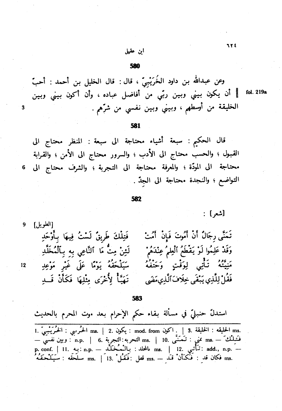 580 - وعن عبد الله بن داود الخريبي، قال: قال الخليل بن أحمد: أحب ((أن يكون بيني وبين ربي من أفاضل عباده، وأن أكون بيني وبين الخليقة من أوسطهم، وبيني وبين نفسي من شرهم.