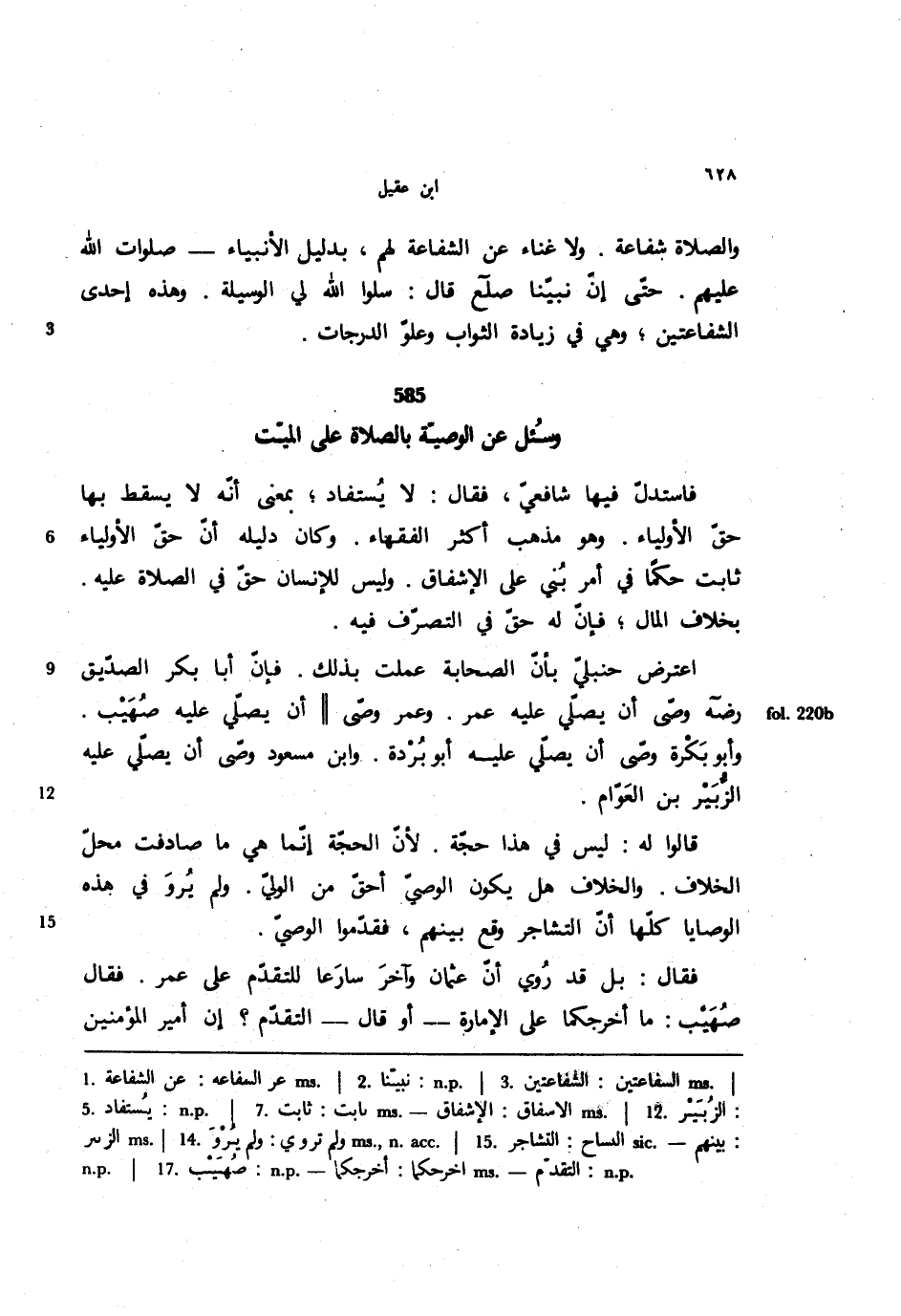 فاستدل فيها شافعي، فقال: لا يستفاد؛ بمعنى أنه لا يسقط بها حق الأولياء. وهو مذهب أكثر الفقهاء. وكان دليله أن حق الأولياء ثابت حكماً في أمر بني على الإشفاق. وليس للإنسان حق في الصلاة عليه. بخلاف المال؛ فإن له حق في التصرف فيه.
