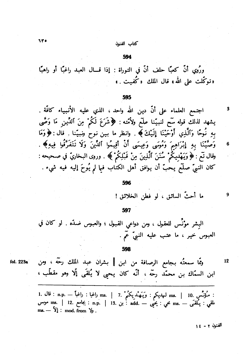 595 - اجتمع العلماء على أن دين الله واحد، الذي عليه الأنبياء كافة. يشهد لذلك قوله سح لنبينا صلع ولأمته: {شرع لكم من الدين ما وصى به نوحاً والذي أوحينا إليك}. وانظر ما بين نوح ونبينا. قال: {وما وصينا به إبراهيم وموسى وعيسى أن أقيموا الدين ولا تتفرقوا فيه}. وقال تع: {ويهديكم سنن الذين من قبلكم}. وروى البخاري في صحيحه: كان النبي صلع يحب أن يوافق أهل الكتاب فيما لم يوح إليه فيه شيء.