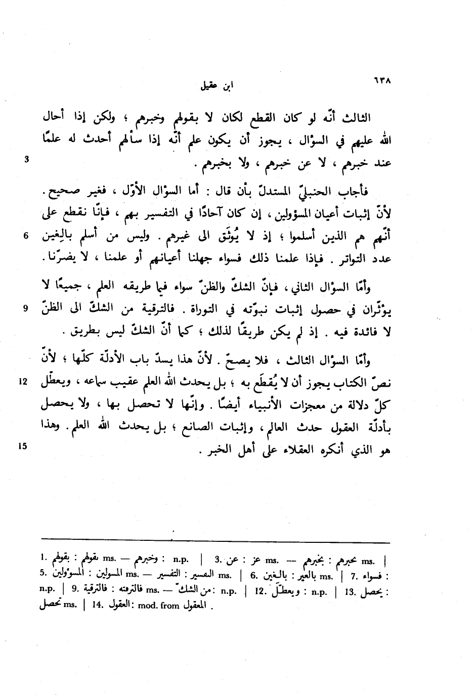 وأما السؤال الثالث، فلا يصح. لأن هذا يسد باب الأدلة كلها؛ لأن نص الكتاب يجوز أن لا يقطع به؛ بل يحدث الله العلم عقيب سماعه، ويعطل كل دلالة من معجزات الأنبياء أيضاً. وإنها لا تحصل بها، ولا يحصل بأدلة العقول حدث العالم، وإثبات الصانع؛ بل يحدث الله العلم. وهذا هو الذي أنكره العقلاء على أهل الخبر.