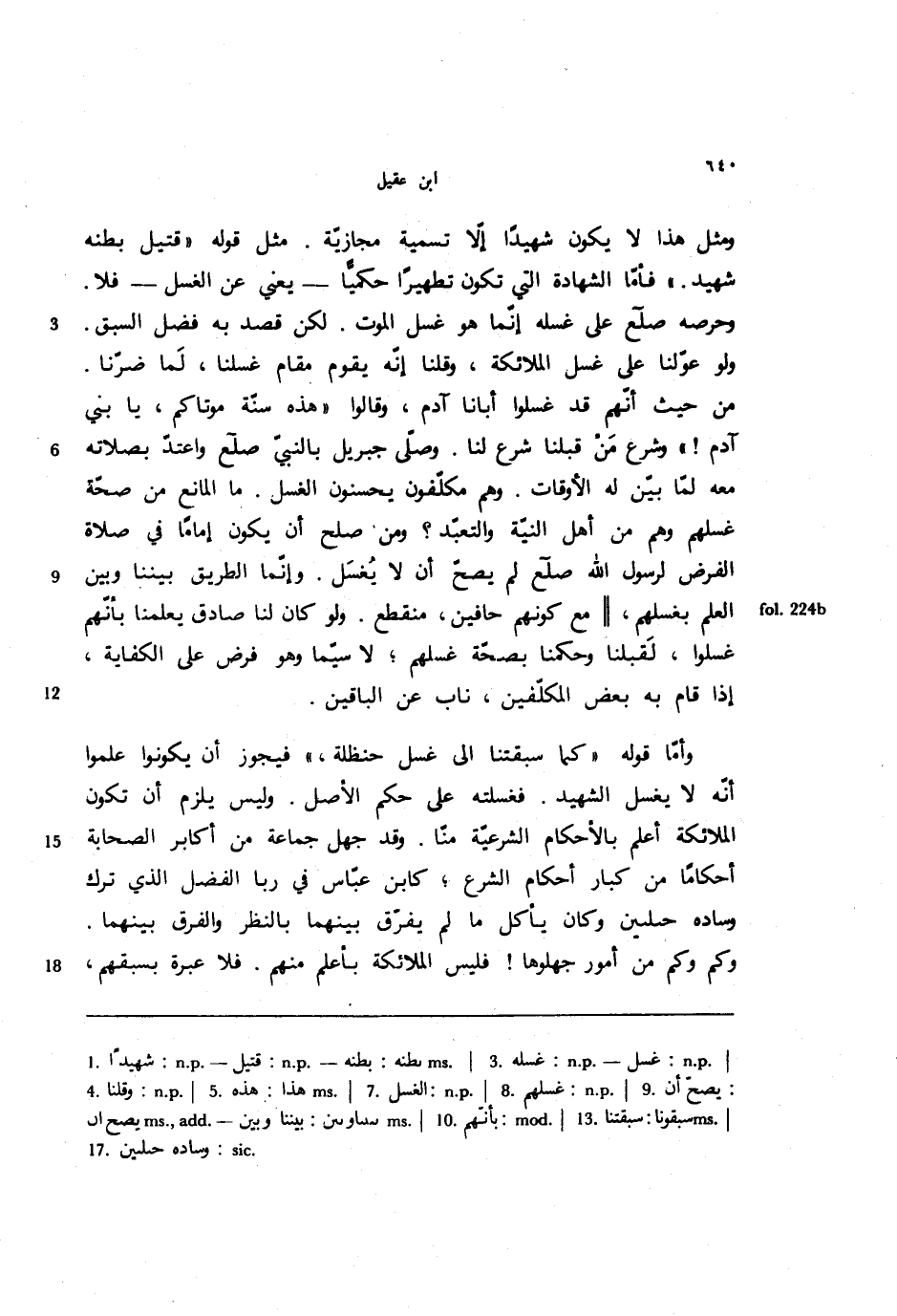ومثل هذا لا يكون شهيداً إلا تسمية مجازية. مثل قوله ((قتيل بطنه شهيد)). فأما الشهادة التي تكون تطهيراً حكمياً-يعني عن الغسل- فلا. وحرصه صلع على غسله إنما هو غسل الموت. لكن قصد به فضل السبق. ولو عولنا على غسل الملائكة، وقلنا إنه يقوم مقام غسلنا، لما ضرنا. من حيث أنهم قد غسلوا أبانا آدم، وقالوا ((هذه سنة موتاكم، يا بني آدم! )) وشرع من قبلنا شرع لنا. وصلى جبريل بالنبي صلع واعتد بصلاته معه لما بين له الأوقات. وهم مكلفون يحسنون الغسل. ما المانع من صحة غسلهم وهم من أهل النية والتعبد؟ ومن صلح أن يكون إماماً في صلاة الفرض لرسول الله صلع لم يصح أن لا يغسل. وإنما الطريق بيننا وبين العلم بغسلهم، مع كونهم حافين، منقطع. ولو كان لنا صادق يعلمنا بأنهم غسلوا، لقبلنا وحكمنا بصحة غسلهم؛ لاسيما وهو فرض على الكفاية، إذا قام به بعض المكلفين، ناب عن الباقين.