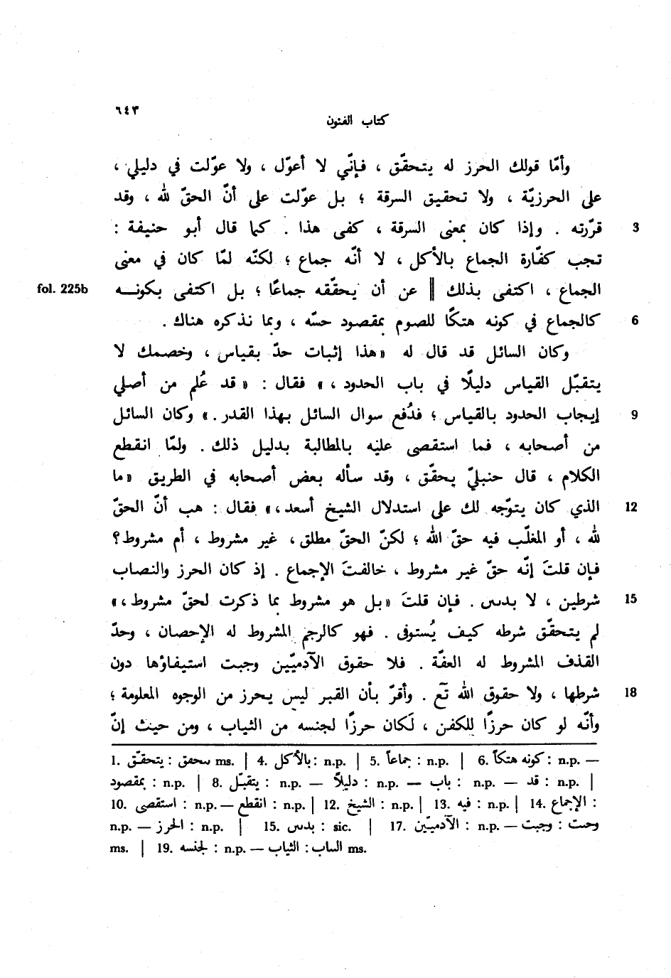 وكان السائل قد قال له ((هذا إثبات حد بقياس، وخصمك لا يتقبل القياس دليلاً في باب الحدود))، فقال: ((قد علم من أصلي إيجاب الحدود بالقياس؛ فدفع سوال السائل بهذا القدر)). وكان السائل من أصحابه، فما استقصى عليه بالمطالبة بدليل ذلك. ولما انقطع الكلام، قال حنبلي يحقق، وقد سأله بعض أصحابه في الطريق ((ما الذي كان يتوجه لك على استدلال الشيخ أسعد))، فقال: هب أن الحق لله، أو المغلب فيه حق الله؛ لكن الحق مطلق، غير مشروط، أم مشروط؟ فإن قلت إنه حق غير مشروط، خالفت الإجماع. إذ كان الحرز والنصاب شرطين، لاب؟ . فإن قلت ((بل هو مشروط بما ذكرت لحق مشروط))، لم يتحقق شرطه كيف يستوفى. فهو كالرجم المشروط له الإحصان، وحد القذف المشروط له العفة. فلا حقوق الآدميين وجبت استيفاؤها دون شرطها، ولا حقوق الله تع. وأقر بأن القبر ليس يحرز من الوجوه المعلومة؛ وأنه لو كان حرزاً للكفن، لكان حرزاً لجنسه من الثياب، ومن حيث إن