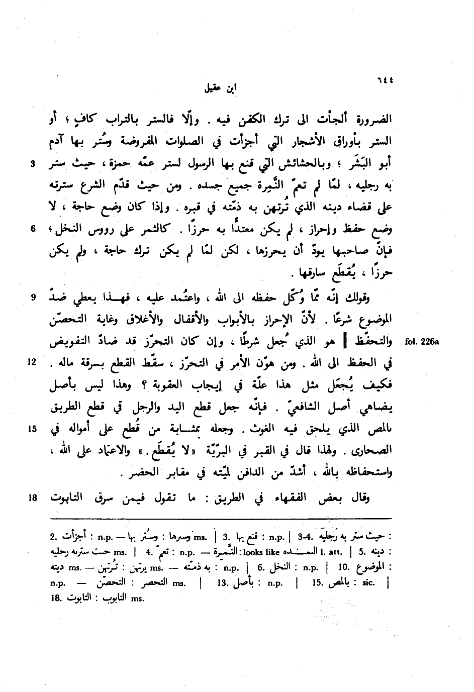 الضرورة ألجأت إلى ترك الكفن فيه. وإلا فالستر بالتراب كافٍ؛ أو الستر بأوراق الأشجار التي أجزأت في الصلوات المفروضة وستر بها آدم أبو البشر؛ وبالحشائش التي قنع بها الرسول لستر عمه حمزة، حيث ستر به رجليه، لما لم تعم النمرة جميع جسده. ومن حيث قدم الشرع سترته على قضاء دينه الذي ترتهن به ذمته في قبره. وإذا كان وضع حاجة، لا وضع حفظ وإحراز، لم يكن معتداً به حرزاً. كالثمر على رووس النخل؛ فإن صاحبها يود أن يحرزها، لكن لما لم يكن ترك حاجة، ولم يكن حرزاً، يقطع سارقها.