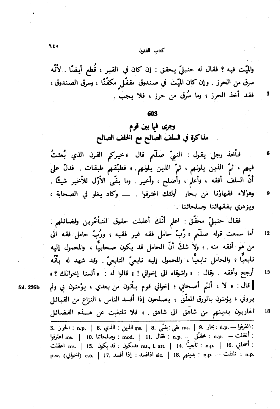 فقال حنبلي محقق: اعلم أنك أغفلت حقوق المتأخرين وفضائلهم. أما سمعت قوله صلعم ((رب حامل فقه غير فقيه؛ ورب حامل فقه إلى من هو أفقه منه)). ولاشك أن الحامل قد يكون صحابياً، والمحمول إليه تابعياً؛ والحامل تابعياً، والمحمول إليه تابعي التابعي. وقد شهد له بأنه أرجح وأفقه. وقال: ((واشوقاه إلى إخواني! )) قالوا له: ((ألسنا إخوانك؟ )) قال ((لا، أنتم أصحابي؛ إخواني قوم يأتون من بعدي، يؤمنون بي ولم يروني؛ يؤمنون بالورق المعلق؛ يصلحون إذا أفسد الناس؛ النزاع من القبائل الهاربون بدينهم من شاهق إلى شاهق)). فلا تلتفت عن هذه الفضائل