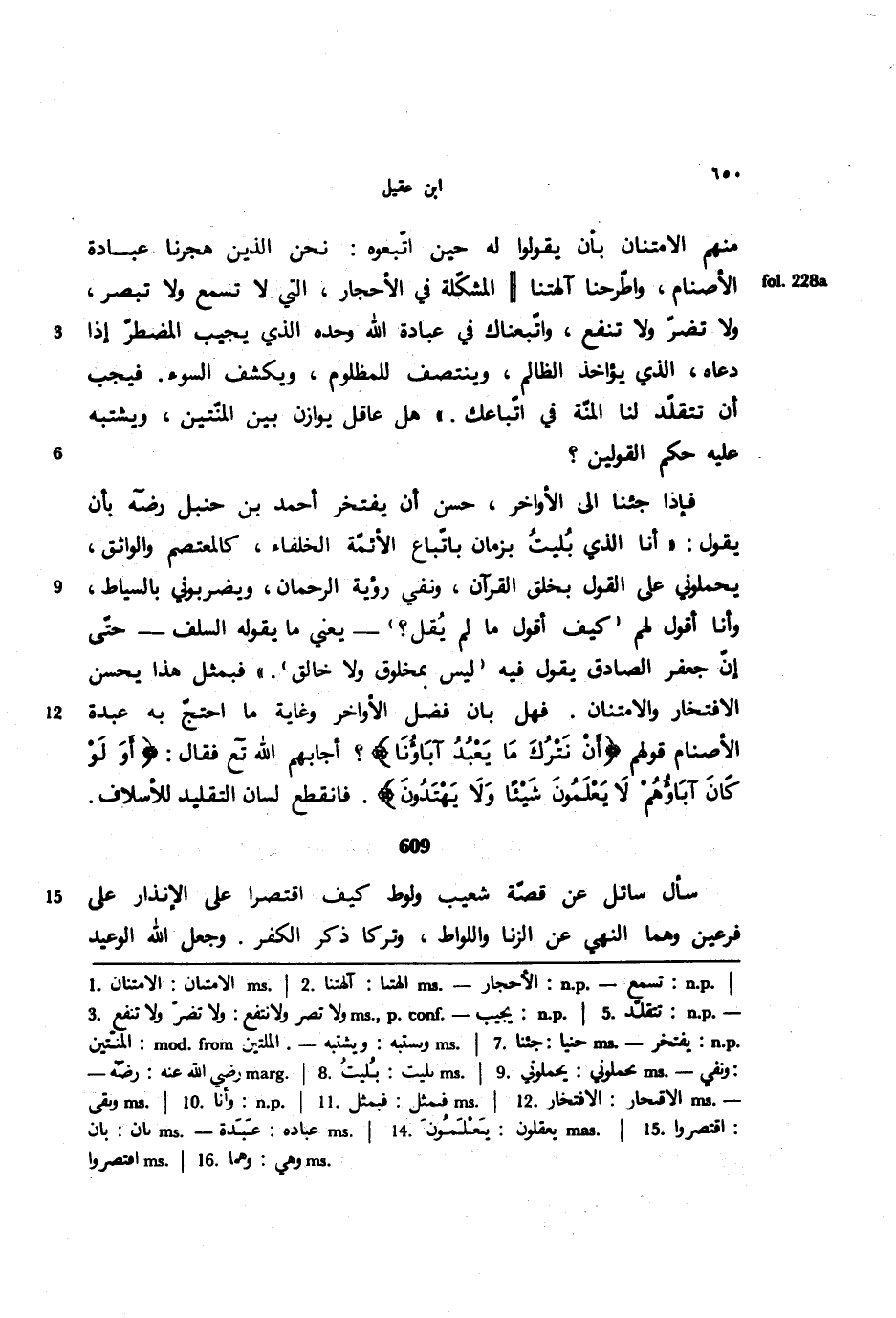 فإذا جئنا إلى الأواخر، حسن أن يفتخر أحمد بن حنبل رضه بأن يقول: ((أنا الذي بليت بزمان باتباع الأئمة الخلفاء، كالمعتصم والواثق، يحملوني على القول بخلق القرآن، ونفي رؤية الرحمان، ويضربوني بالسياط، وأنا أقول هلم (كيف أقول ما لم يقل؟ ) - يعني ما يقوله السلف- حتى إن جعفر الصادق يقول فيه (ليس بمخلوق ولا خالق))). فبمثل هذا يحسن الافتخار والامتنان. فهل بان فضل الأواخر وغاية ما احتج به عبدة الأصنام قولهم {أن نترك ما يعبد آباؤنا}؟ أجابهم الله تع فقال: {أو لو كان آباؤكم لا يعلمون شيئاً ولا يهتدون}. فانقطع لسان التقليد للأسلاف.