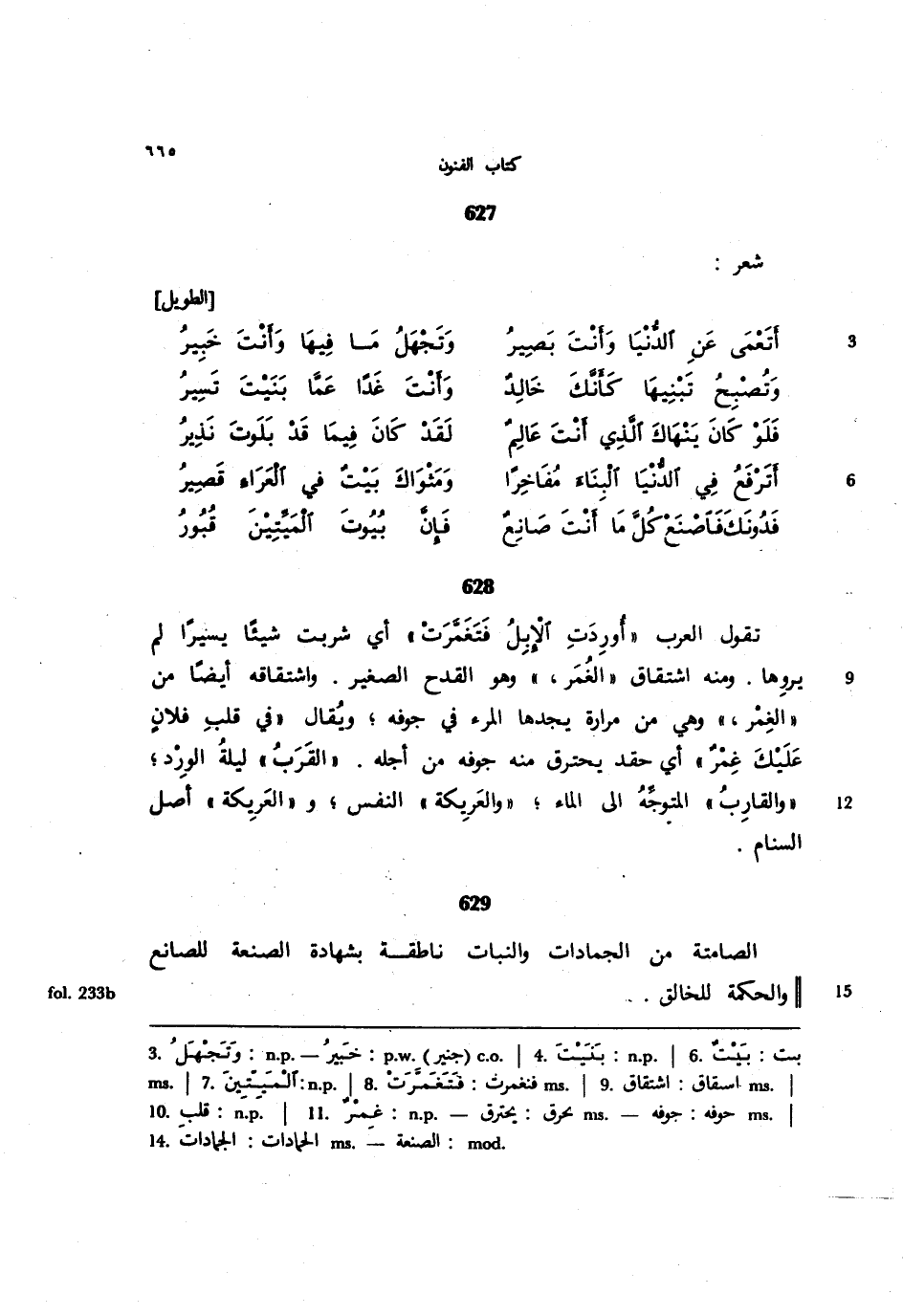 628 - تقول العرب ((أوردت الإبل فتغمرت)) أي شربت شيئًا يسيرًا لم يروها. ومنه اشتقاق ((الغمر، )) وهو القدح الصغير. واشتقاقه أيضًا من ((الغمر، )) وهي من مرارة يجدها المرء في جوفه؛ ويقال ((في قلب فلانٍ عليك غمر)) أي حقد يحترق منه جوفه من أجله. ((القرب)) ليلة الورد؛ ((والقارب)) المتوجه إلى الماء؛ ((والعريكة)) النفس؛ و ((العريكة)) أصل السنام.