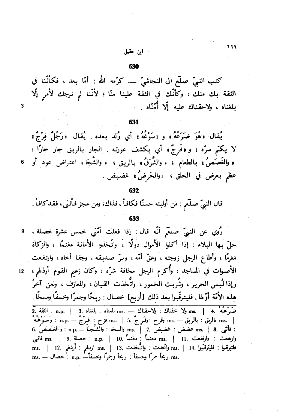 631 - يقال ((هو ضرعه)) و ((سوغه)) أي ولد بعده. يقال ((رجل فرج)) لا يكتم سره؛ و ((فرج)) أي يكشف عورته. الجار بالريق جار جارًا؛ ((والغصص)) بالطعام؛ ((والشرق)) بالريق؛ ((والشجا)) اعتراض عود أو عظم يعرض في الحلق؛ ((والحرض)) غضيض.