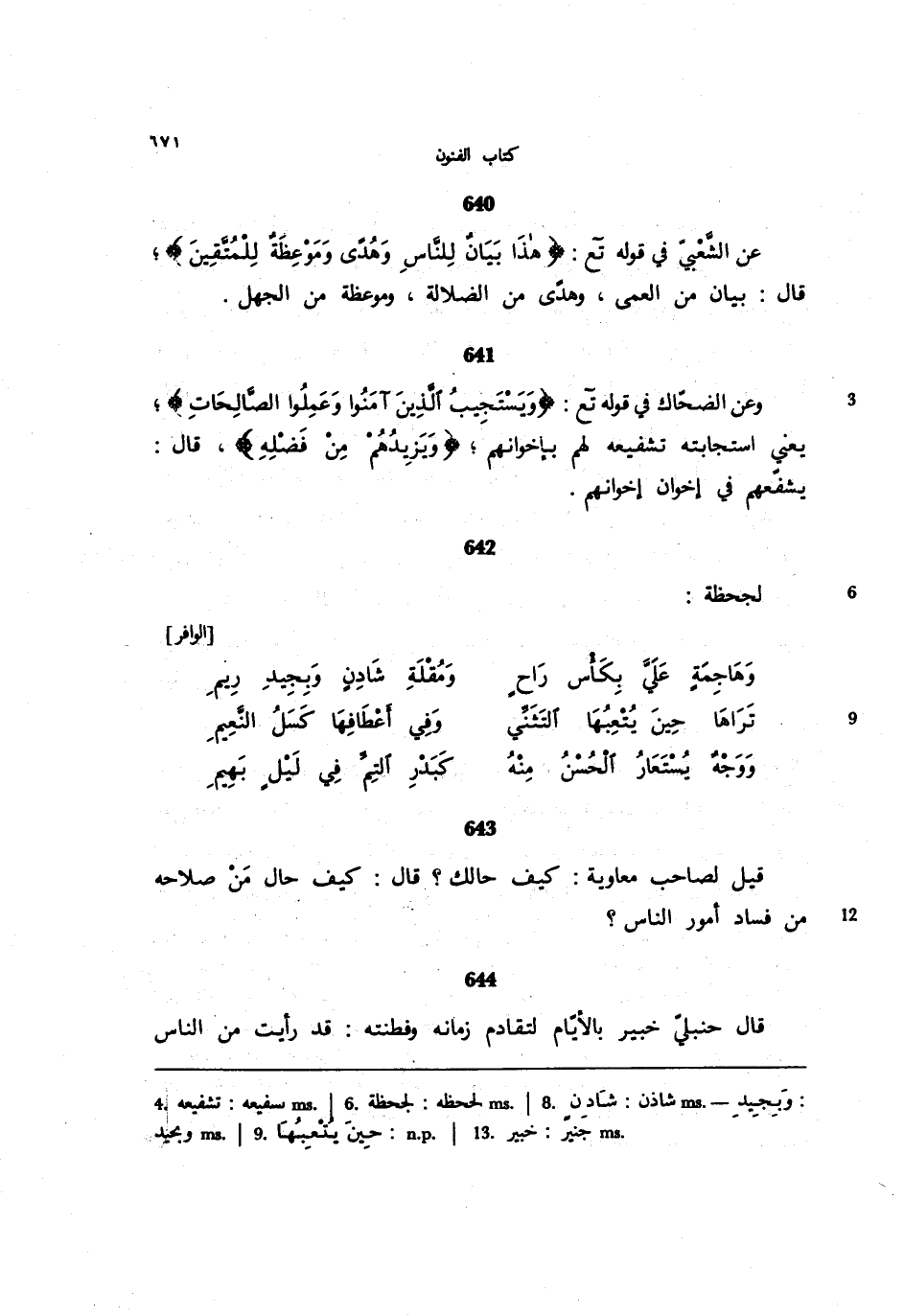 640 - عن الشعبي في قوله تع: {هذا بيان للناس وهدىً وموعظة للمتقين}؛ قال: بيان من العمى، وهدىً من الضلالة، وموعظة من الجهل.