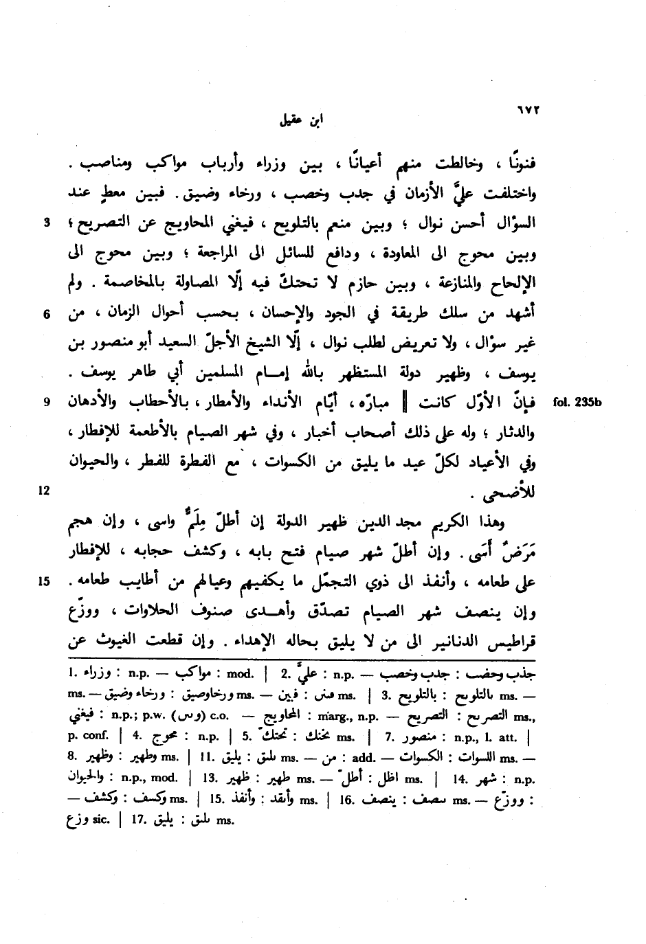 فنونًا، وخالطت منهم أعيانًا، بين وزراء وأرباب مواكب ومناصب. واختلفت على الأزمان في جدب وخصب، ورخاء وضيق. فبين معطٍ عند السؤال أحسن نوال؛ وبين منعم بالتلويح، فيغني المحاويج عن التصريح؛ وبين محوج إلى المعاودة، ودافع للسائل إلى المراجعة؛ وبين محوج إلى الإلحاح والمنازعة، وبين حازم لا تحتك فيه إلا المصاولة بالمخاصمة. ولم أشهد من سلك طريقة في الجود والإحسان، بحسب أحوال الزمان، من غير سؤال، ولا تعريض لطلب نوال، إلا الشيخ الأجل السعيد أبو منصور بن يوسف، وظهير دولة المستظهر بالله إمام المسلمين أبي طاهر يوسف. فإن الأول كانتمباره، أيام الأنداء والأمطار، بالأحطاب والأدهان والدثار؛ وله على ذلك أصحاب أخبار، وفي شهر الصيام بالأطعمة للإفطار، وفي الأعياد لكل عيد ما يليق من الكسوات، مع الفطرة للفطر، والحيوان للأضحى.