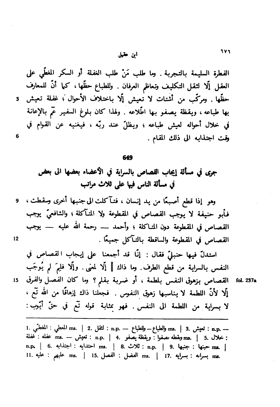 استدل فيها حنبلي فقال: إنا قد أجمعنا على إيجاب القصاص في النفس بالسراية من قطع الطرف. وما ذاكإلا لمعنى. وإلا فلم لم يوجب القصاص بزهوق النفس بلطمة، أو ضربة بقلم؟ وما كان الفصل والفرق إلا لأن اللطمة لا يناسبها زهوق النفوس. فجعلنا ذاك إزهاقًا من الله تع، لا بسراية من اللطمة إلى النفس. فهو بمثابة قوله تع في حق أيوب: