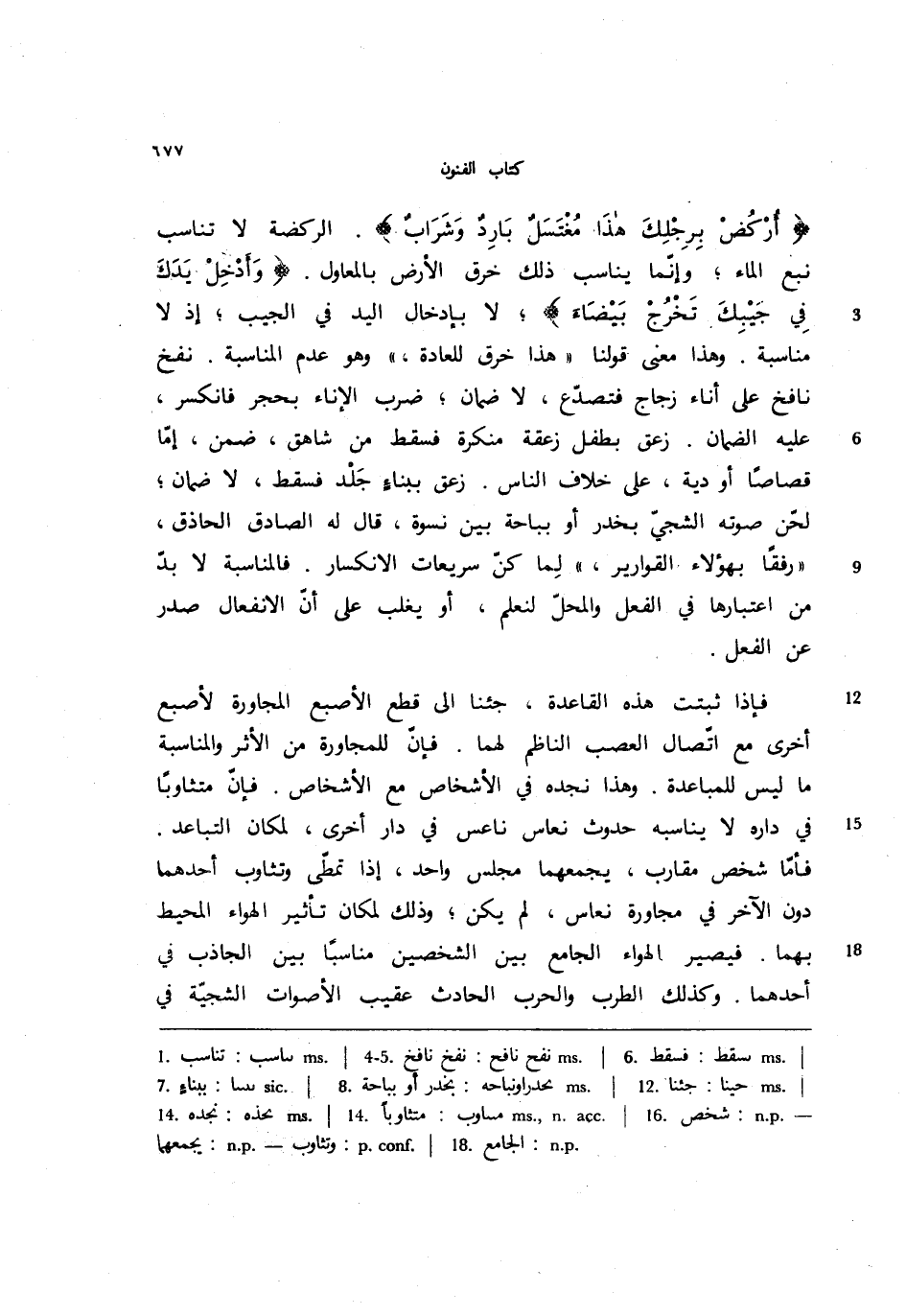 فإذا ثبتت هذه القاعدة، جئنا إلى قطع الأصبع المجاورة لأصبع أخرى مع اتصال العصب الناظم لهما. فإن للمجاورة من الأثر والمناسبة ما ليس للمباعدة. وهذا نجده في الأشخاص مع الأشخاص. فإن متثاوبًا في داره لا يناسبه حدوث نعاس ناعس في دار أخرى، لمكان التباعد. فأما شخص مقارب، يجمعهما مجلس واحد، إذا تمطى وتثاوب أحدهما دون الآخر في مجاورة نعاس، لم يكن؛ وذلك لمكان تأثير الهواء المحيط بهما. فيصير الهواء الجامع بين الشخصين مناسبًا بين الجاذب في أحدهما. وكذلك الطرب والحرب الحادث عقيب الأصوات الشجية في